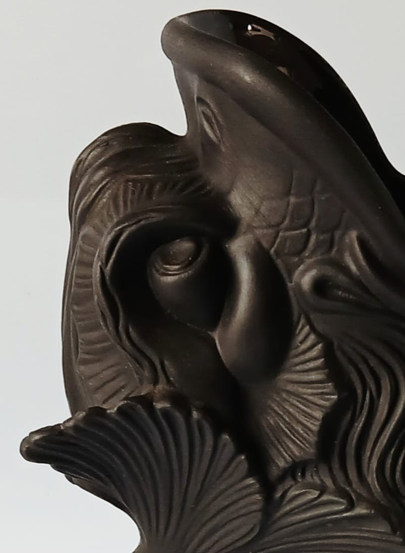 A Wedgwood basalt gurgle fish jug/pitcher which is matt black externally and glazed internally.