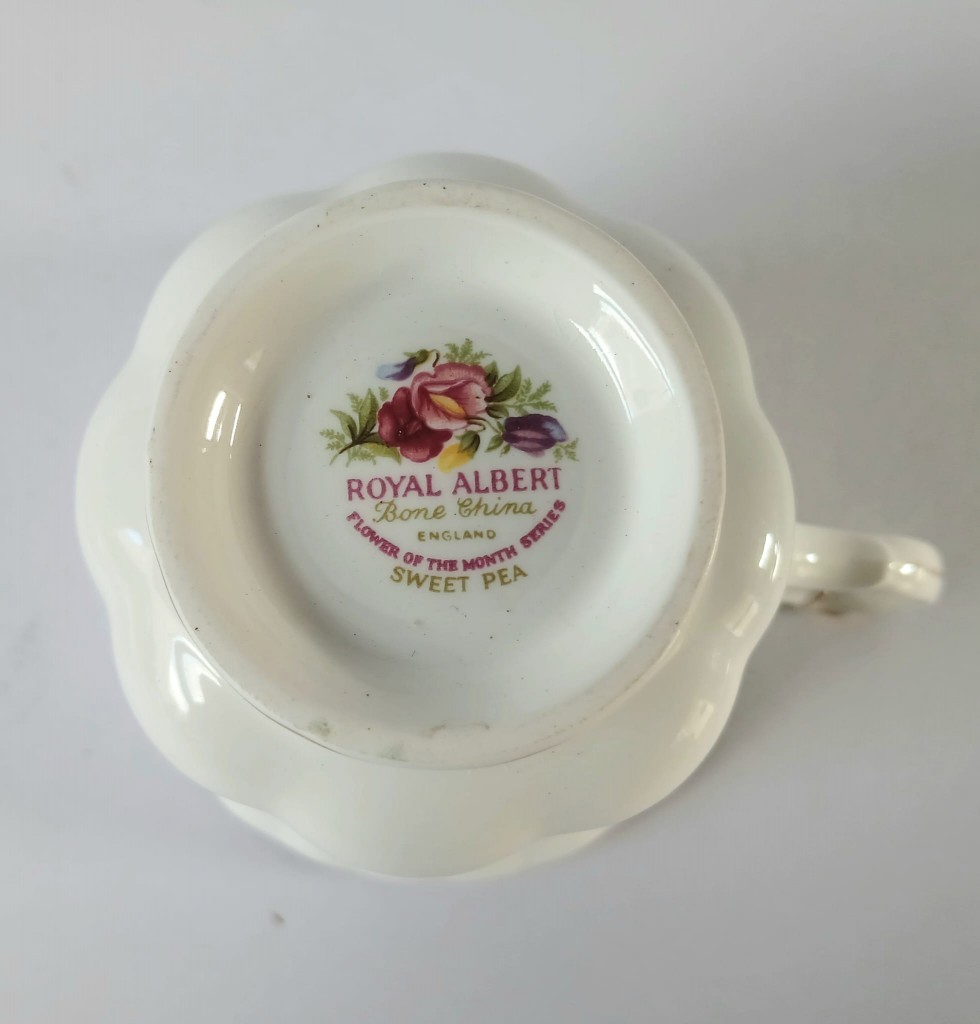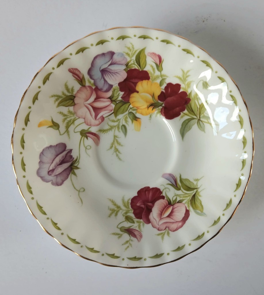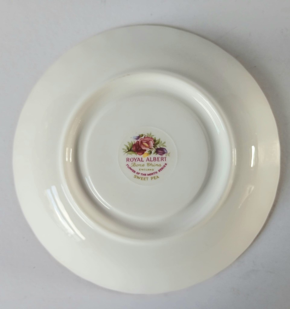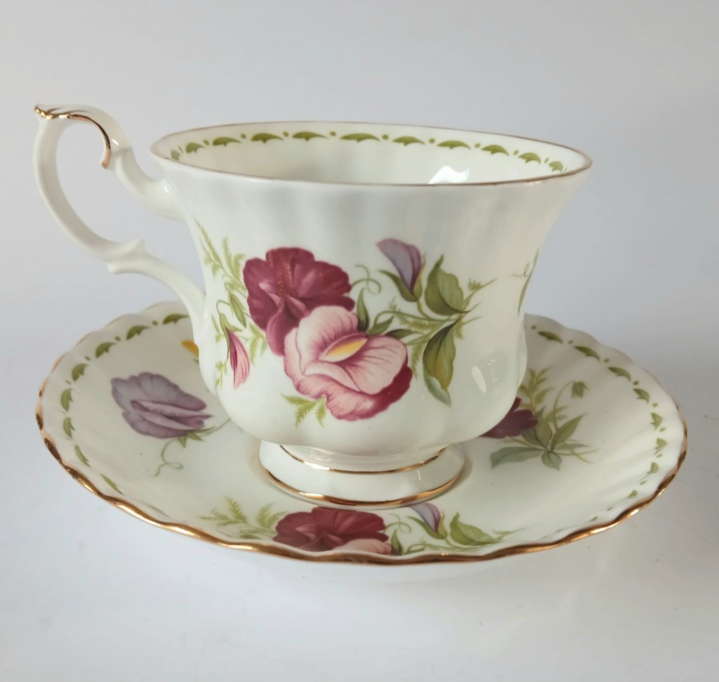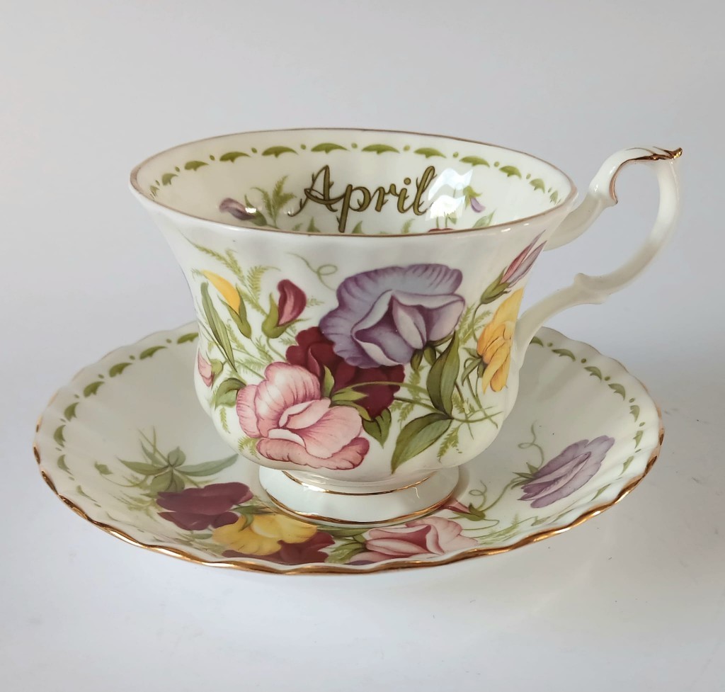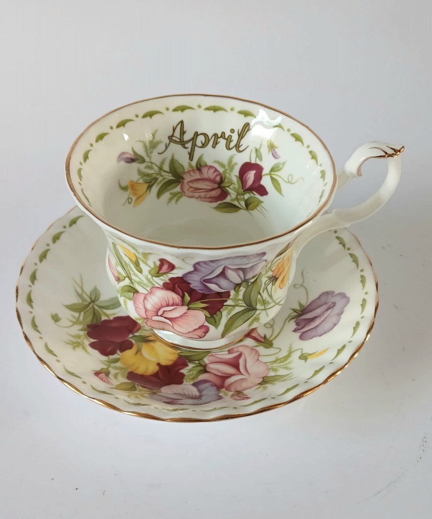 A very pretty tea cup and saucer from the Flower of the Month Series produced by Royal Albert featuring the month of April and Sweet Peas.