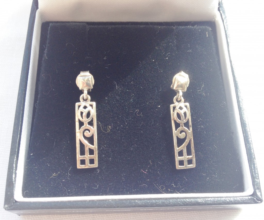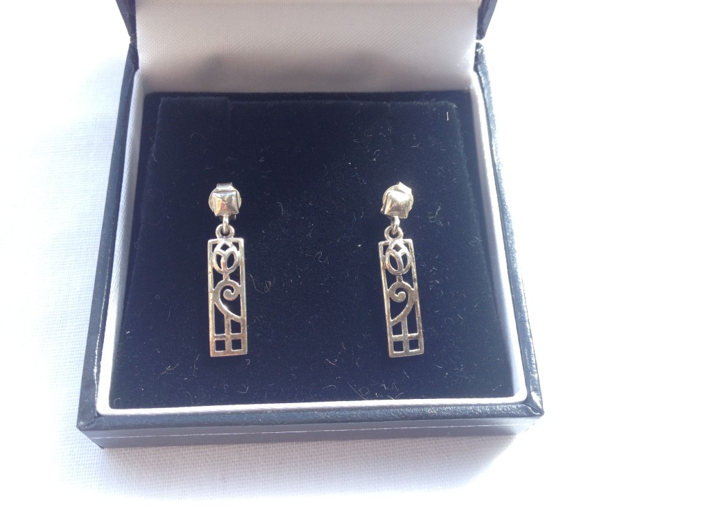 A pair of silver coloured metal earrings for pierced ears featuring a Mackintosh design.