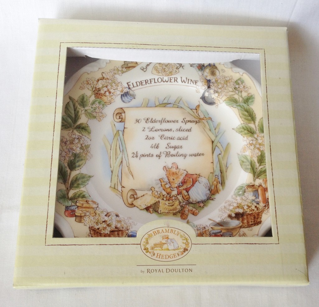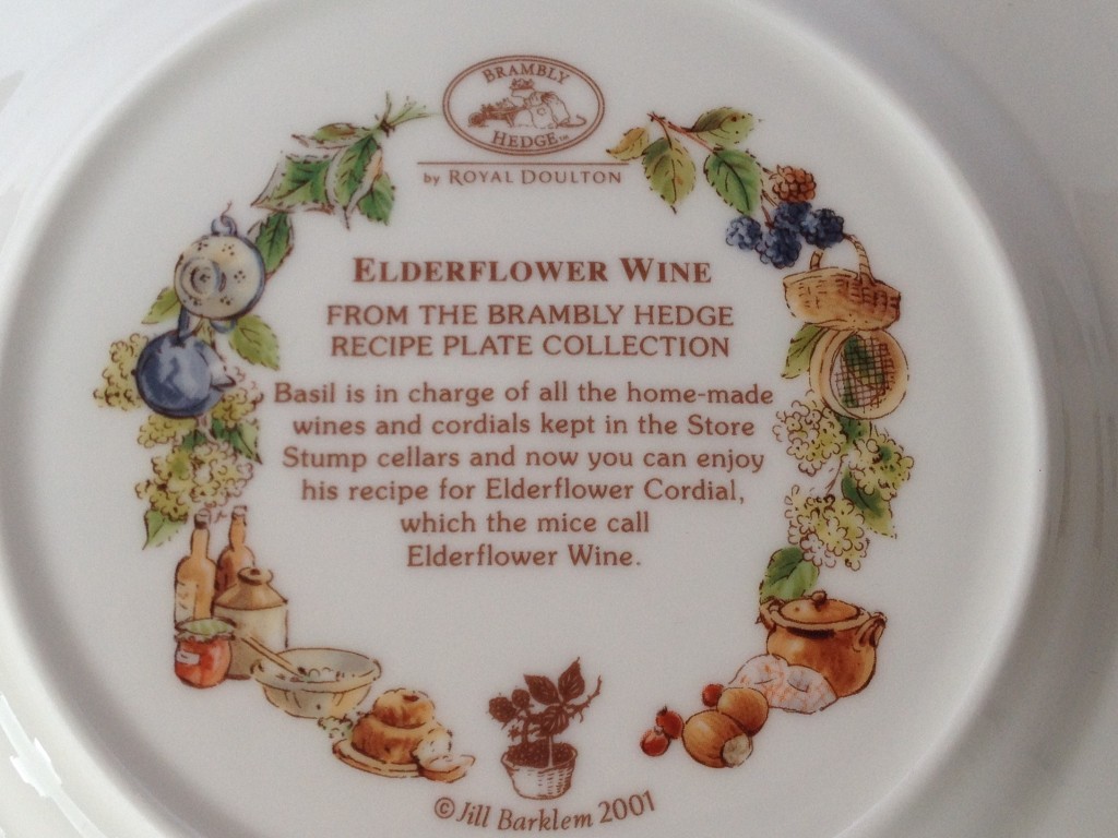 The plate measures approximately 8 inches diameter and on the underside reads 'Royal Doulton - Elderflower Wine - from the Brambly Hedge Recipe Plate Collection – “Basil is in charge of all the home-made wines and cordials kept in the Store Stump cellars and now you can enjoy his recipe for Elderflower Cordial, which the mice call Elderflower Wine!” - Jill Barklem 2001'.