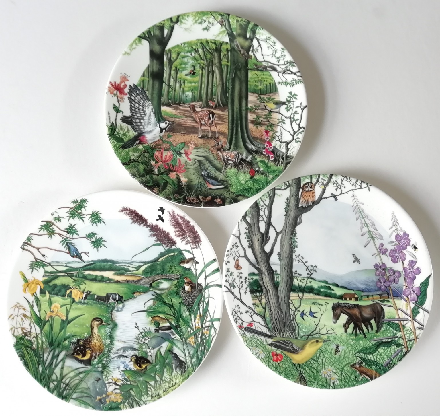 A collection of three Wedgwood plates entitled "The Beechwood, The Mandering Stream and The Hayfield " by Colin Newman.
