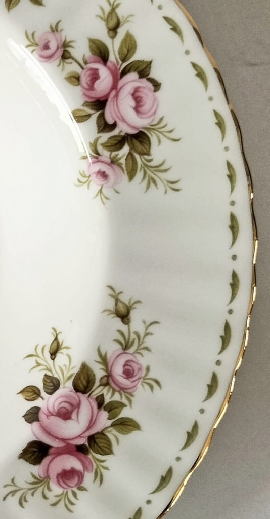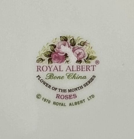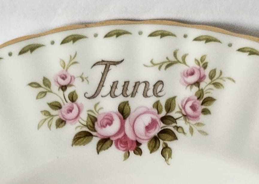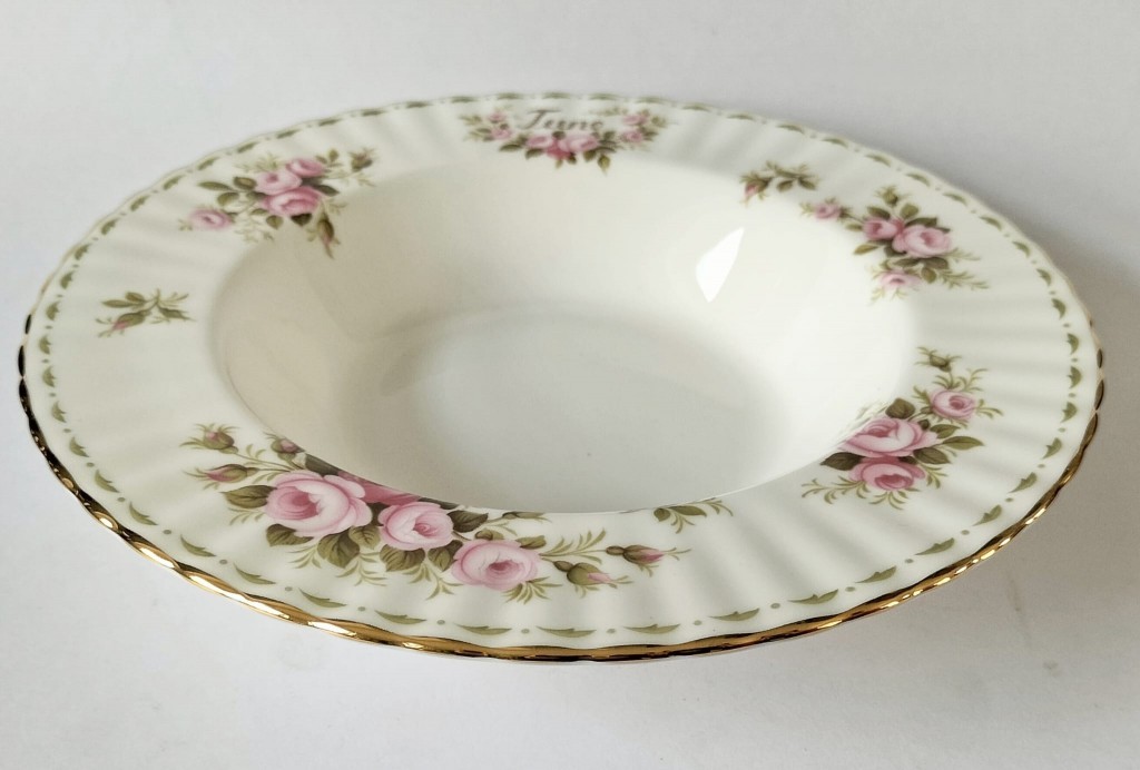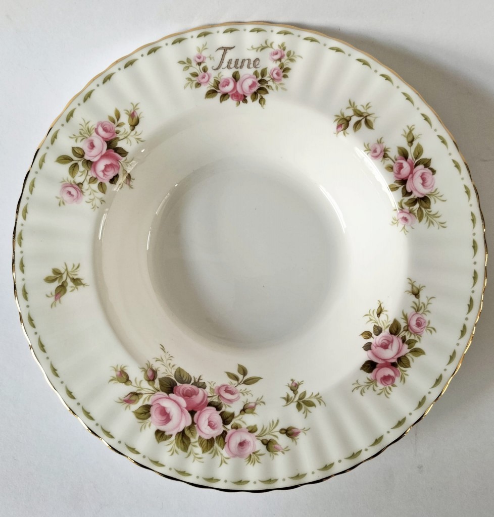 A rimmed bowl from the Flower of the Month Series produced by Royal Albert featuring the month of June and Roses.