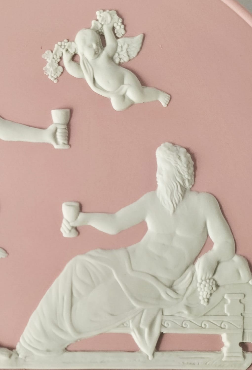 A Wedgwood pink Jasperware plate with white-bas reliefs made to celebrate year 2008.