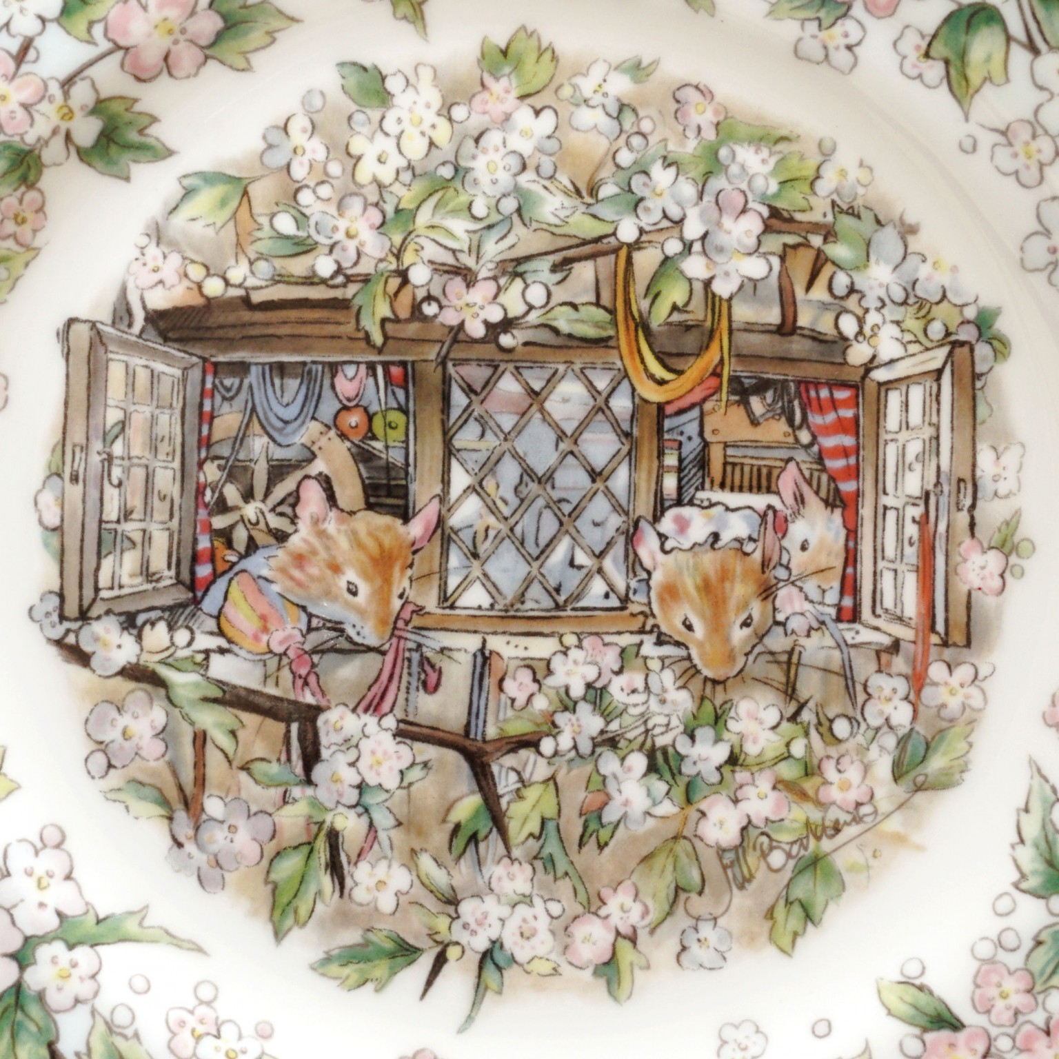The plate measures approximately 8 inches in diameter and on the underside reads "Royal Doulton - The Invitation - A series of four surprise outing plates from the Brambly Hedge Gift Collection -“Lord Woodmouse, meanwhile was working his way down to the stream. The news had travelled ahead of him and all along the hedge excited mice learned one of their windows to ask when the picnic would take place. 'Should we bring tablecloths?' called the weavers who lived in the tangly hawthorn trees. - Jill Barklem 1993”.