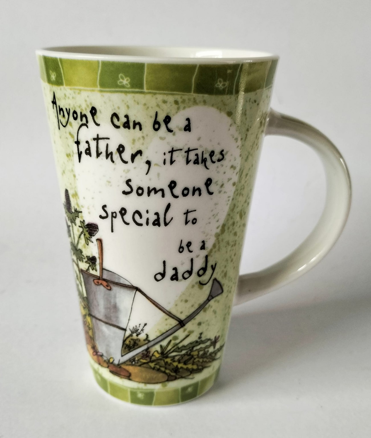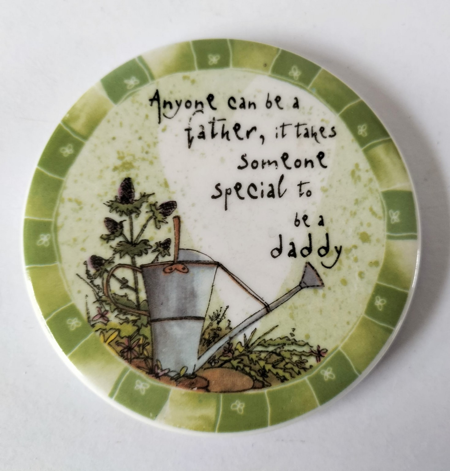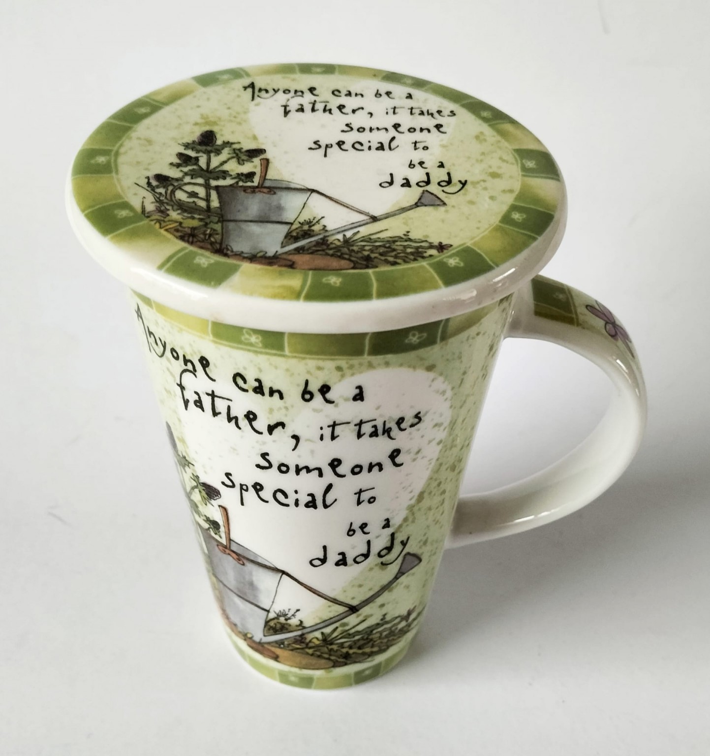 The mug and the coaster feature a watering can and flowers along with the caption "Anyone can be a father, it takes someone special to be a Daddy".