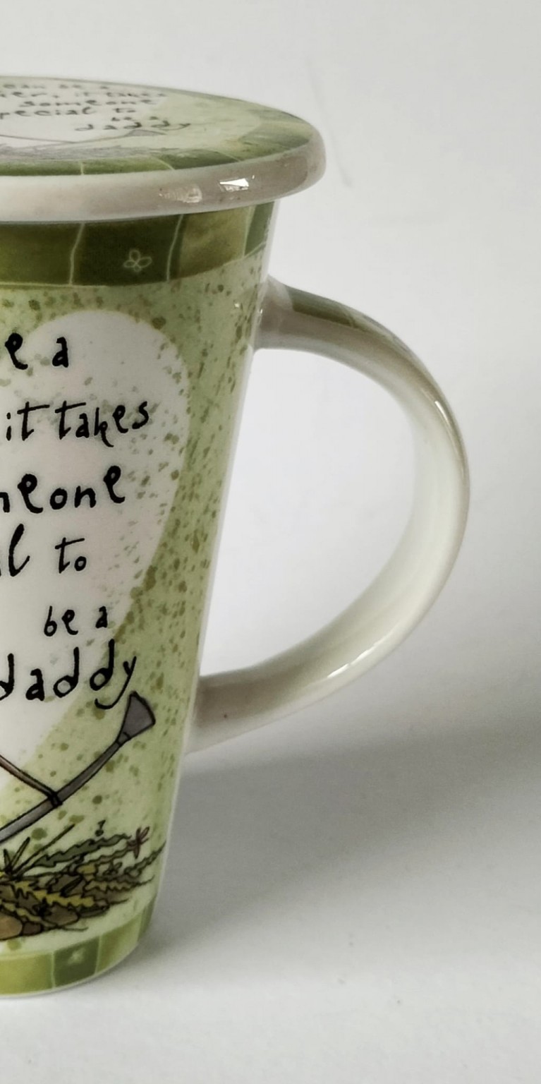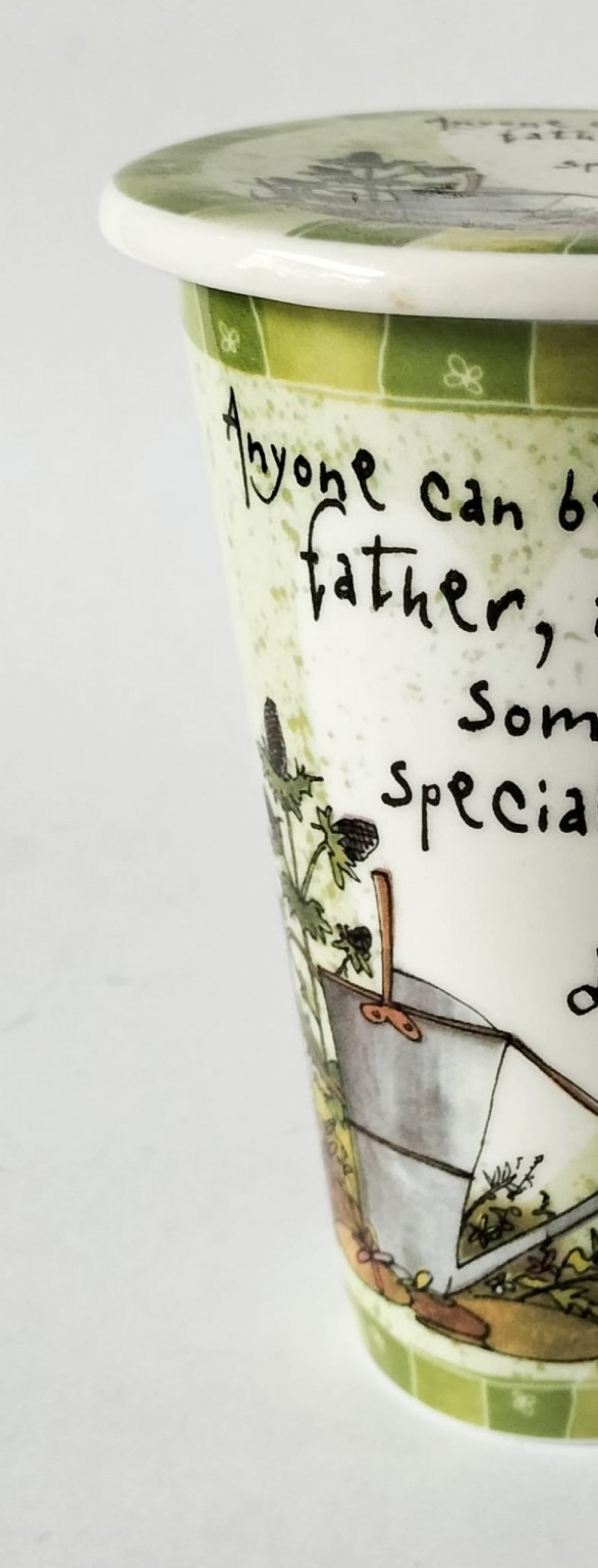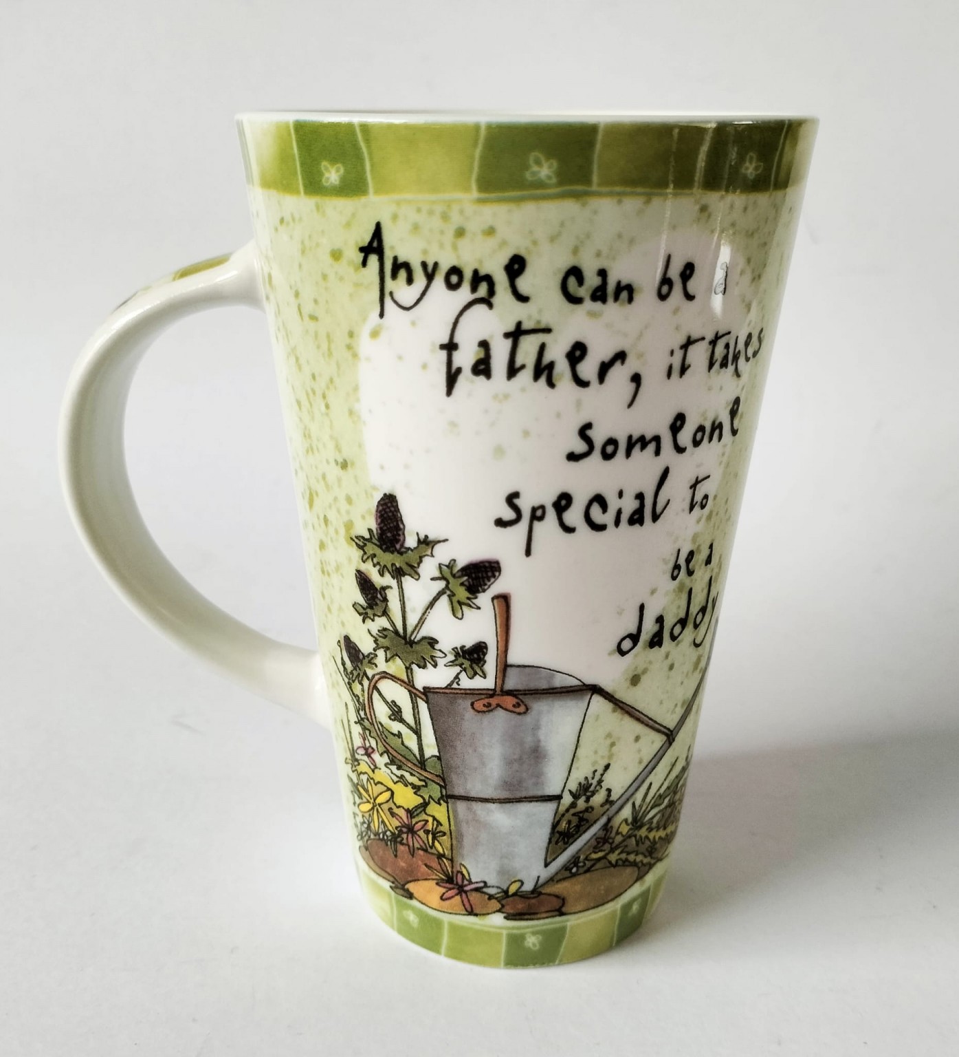 The mug and the coaster feature a watering can and flowers along with the caption "Anyone can be a father, it takes someone special to be a Daddy".