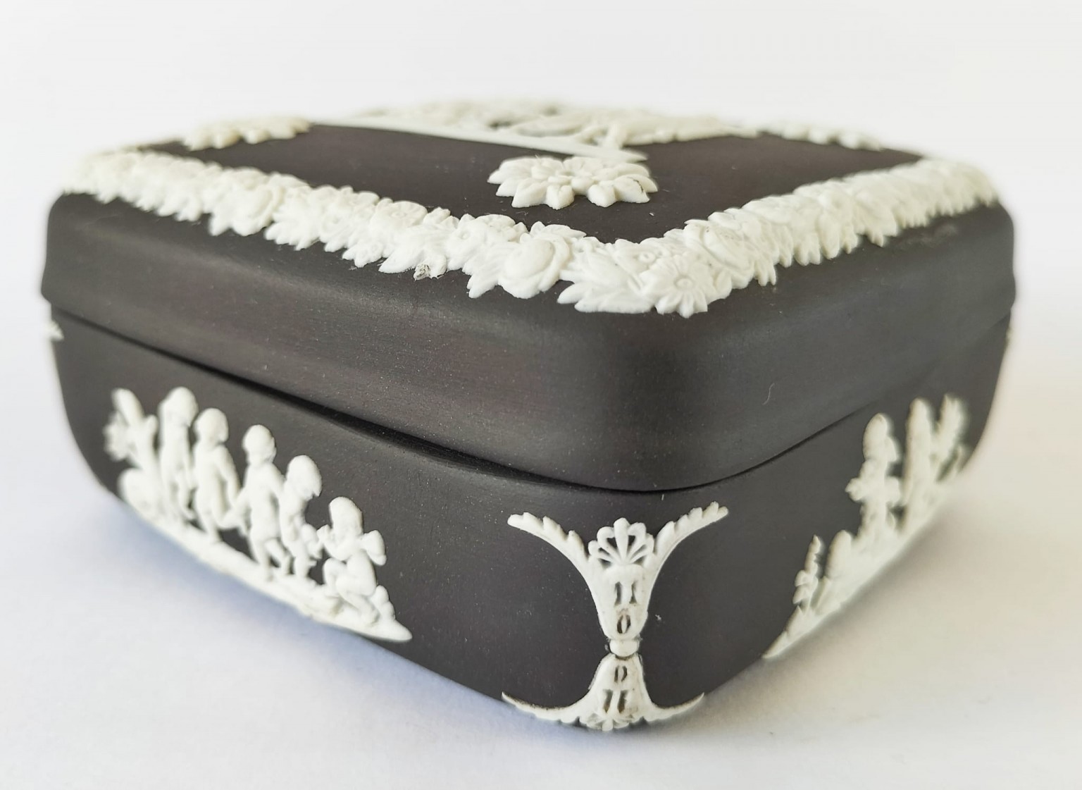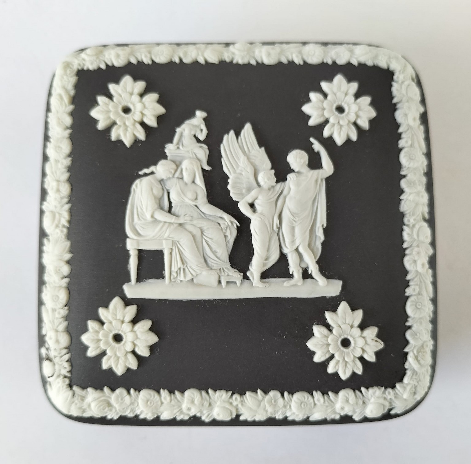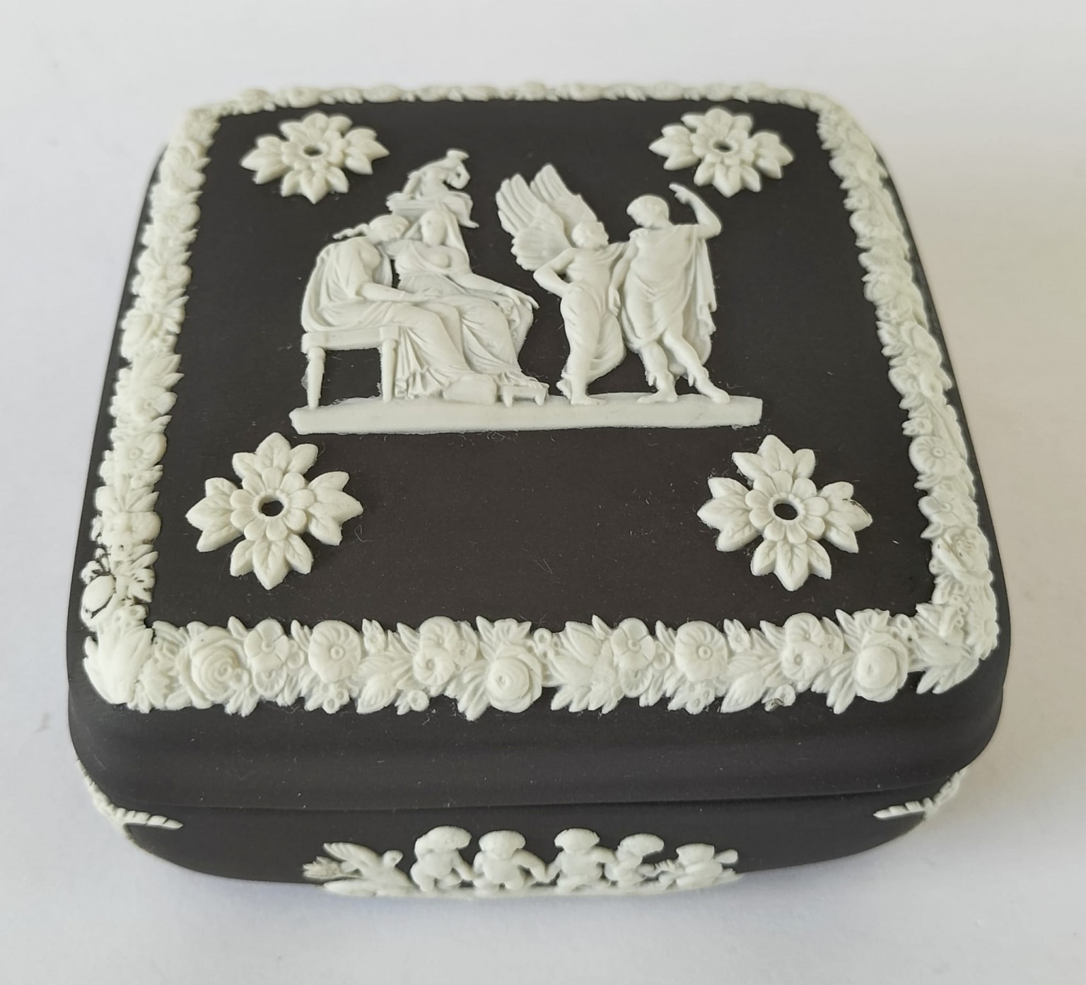 A Wedgwood black Jasperware square trinket box featuring a depiction of the myth of Icarus and Daedalus in white bas-relief surrounded by neo-classical figures and decorative border.