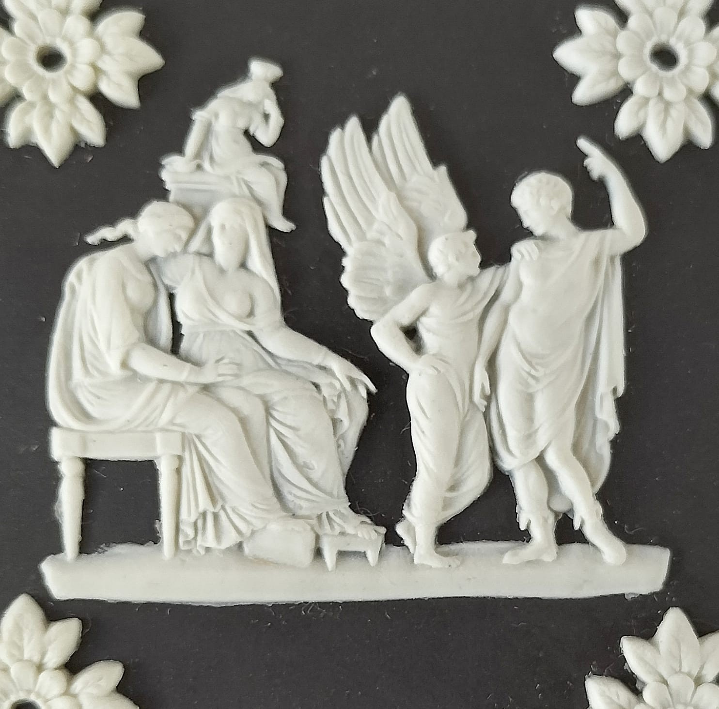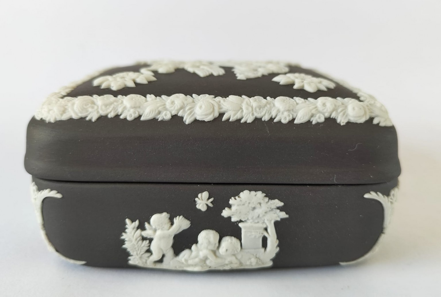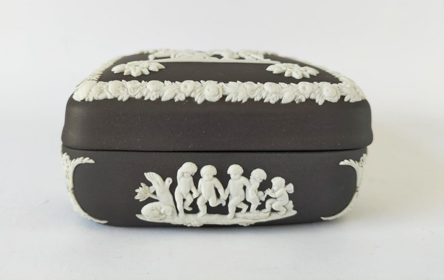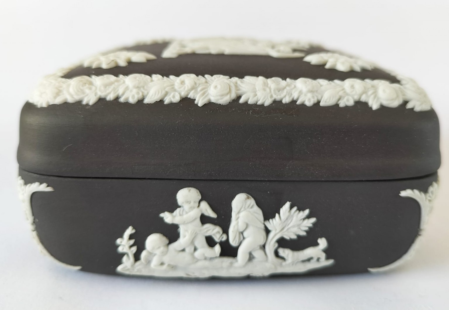 A Wedgwood black Jasperware square trinket box featuring a depiction of the myth of Icarus and Daedalus in white bas-relief surrounded by neo-classical figures and decorative border.