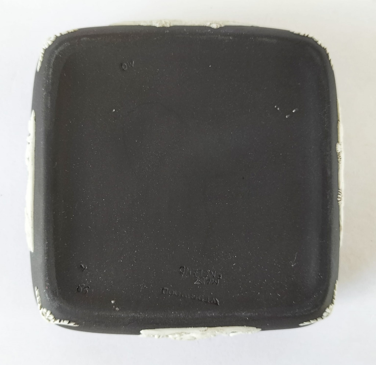 The trinket box measures approximately 4 inches square by approximately 1 3/4 inches deep and is impressed 'Wedgwood Made in England' on the base.
