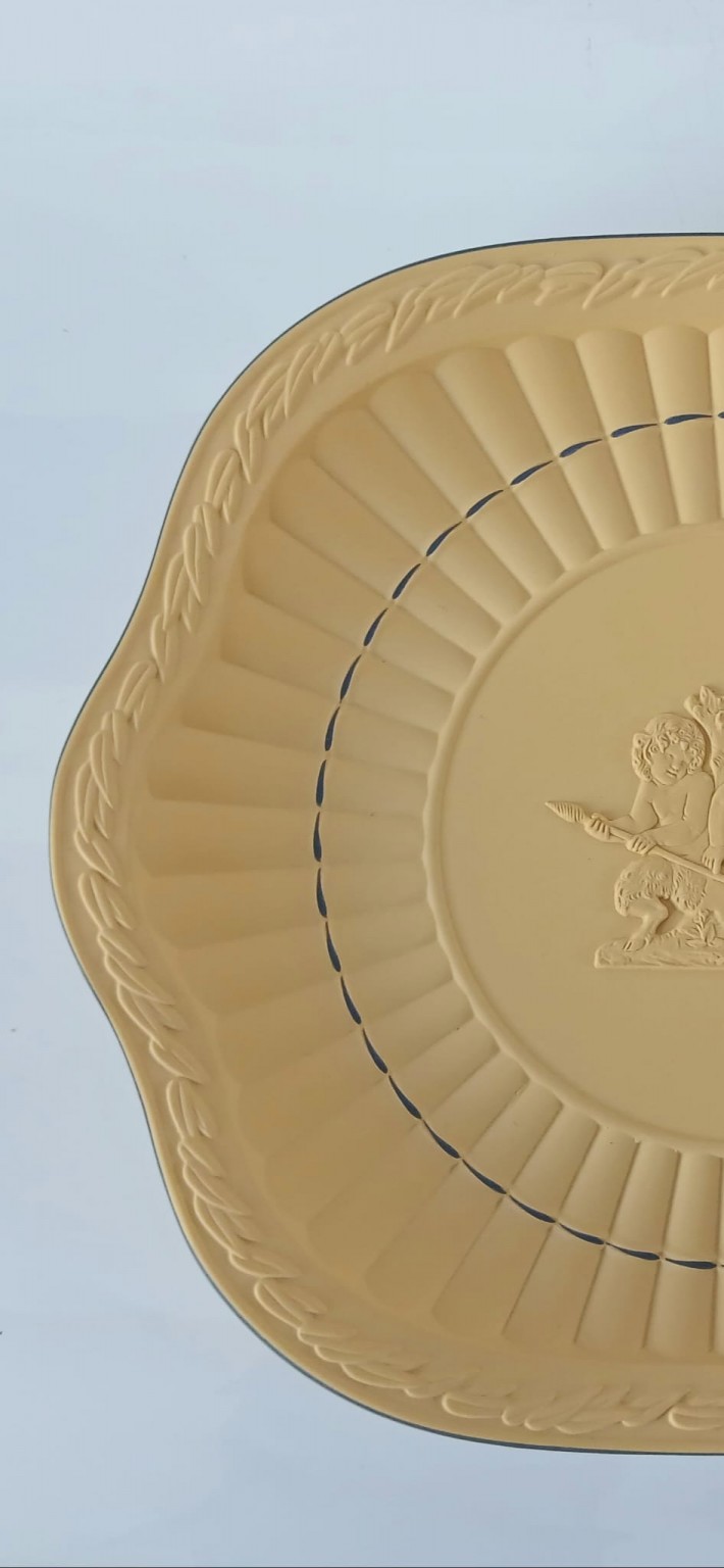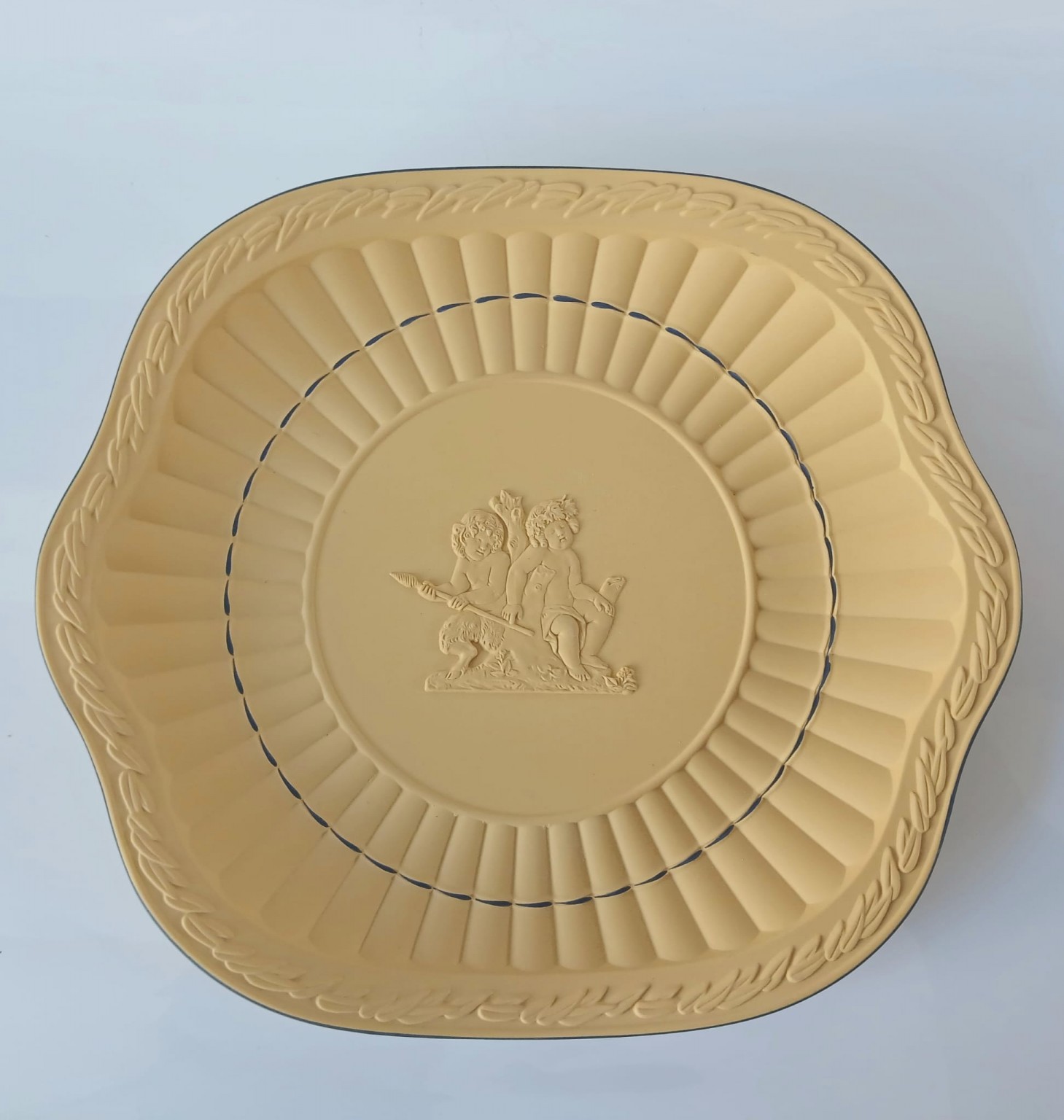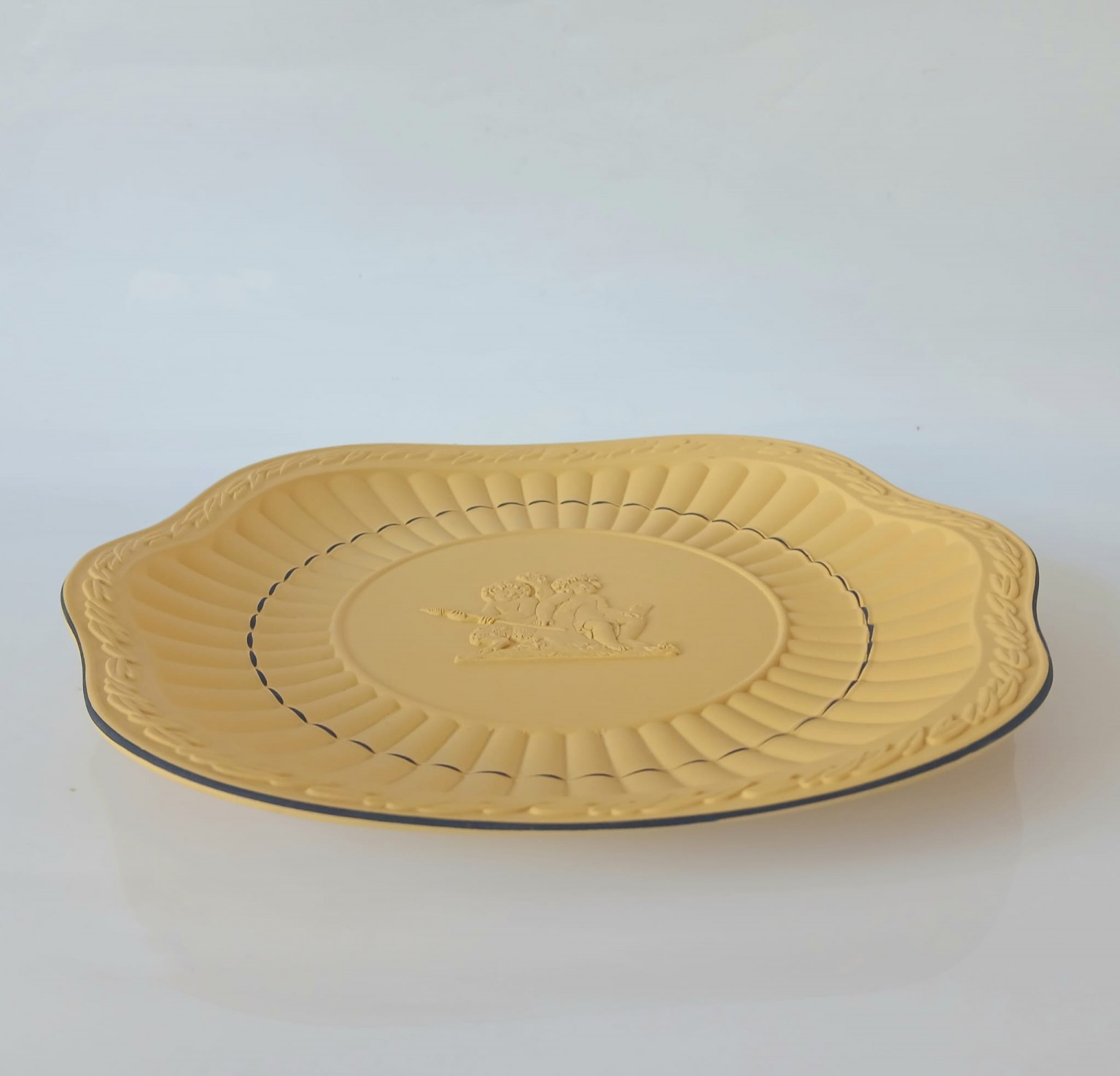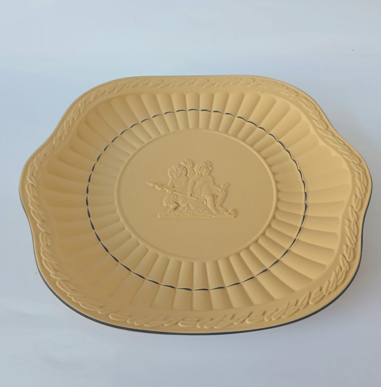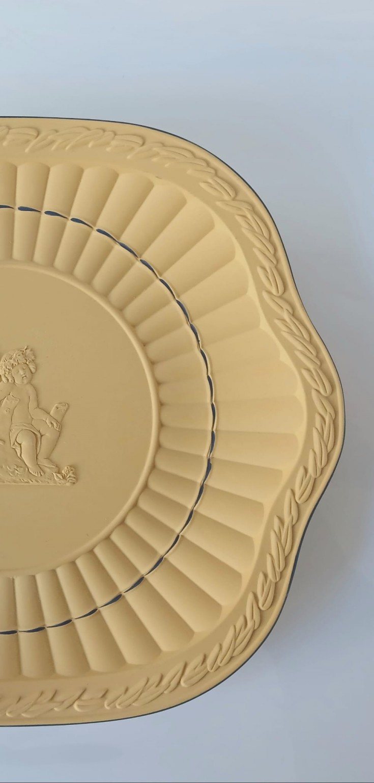A Wedgwood cane jasperware earred plate with blue lines and detailed applique featuring a young Bacchus holding his thyrsus (fennel staff) whilst being held aloft.