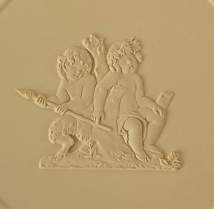 The plate features one of Lady Diana Beauclerk's famous Bacchanalian Boys designs, originally produced for Josiah Wedgwood in 1783.