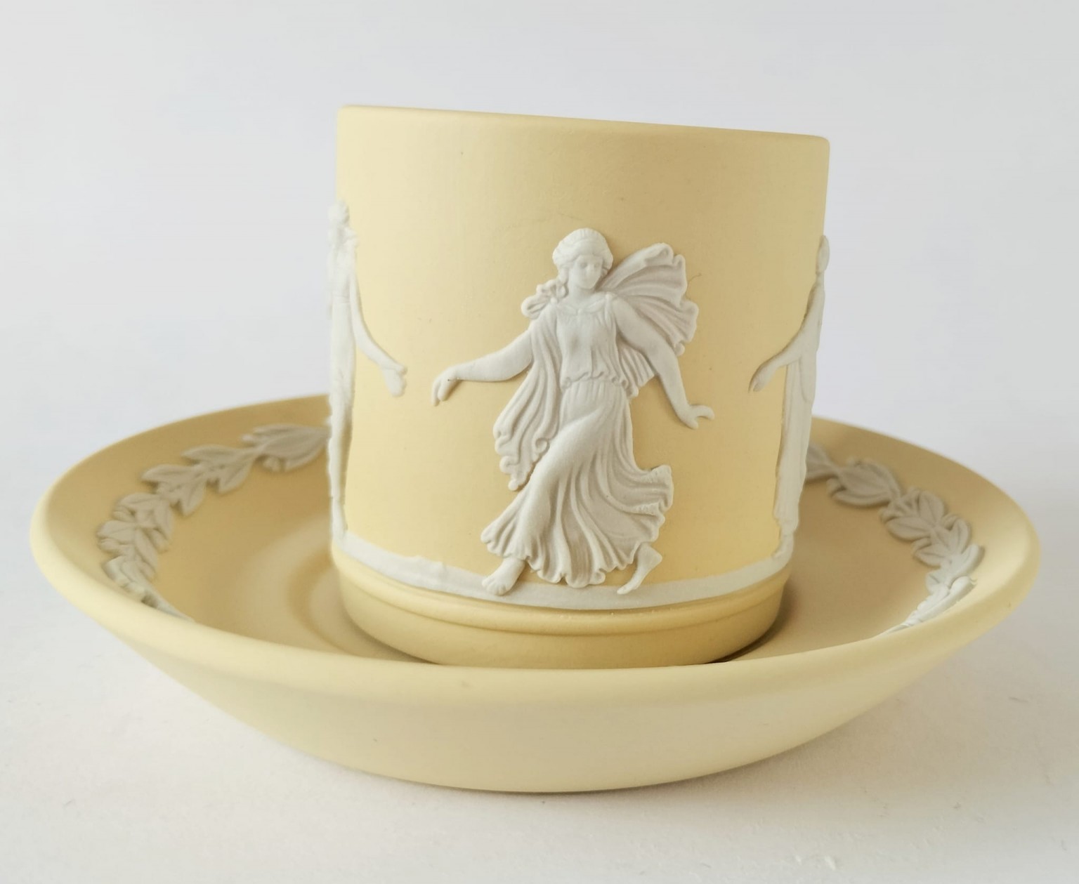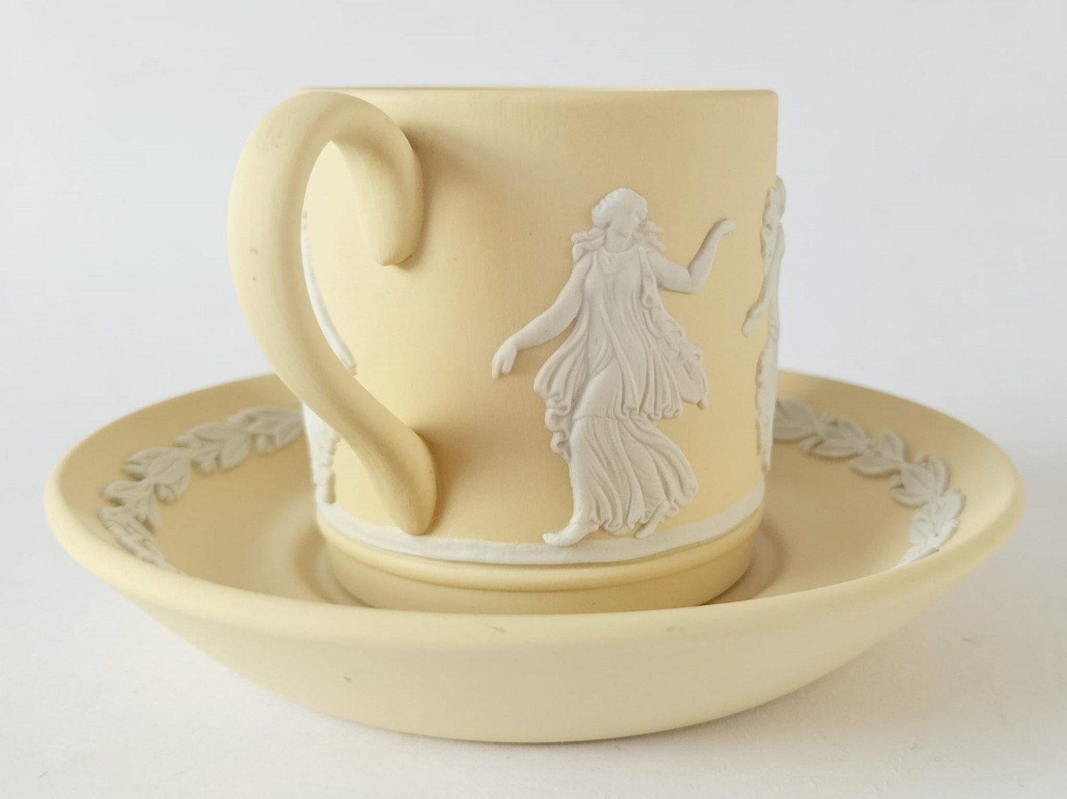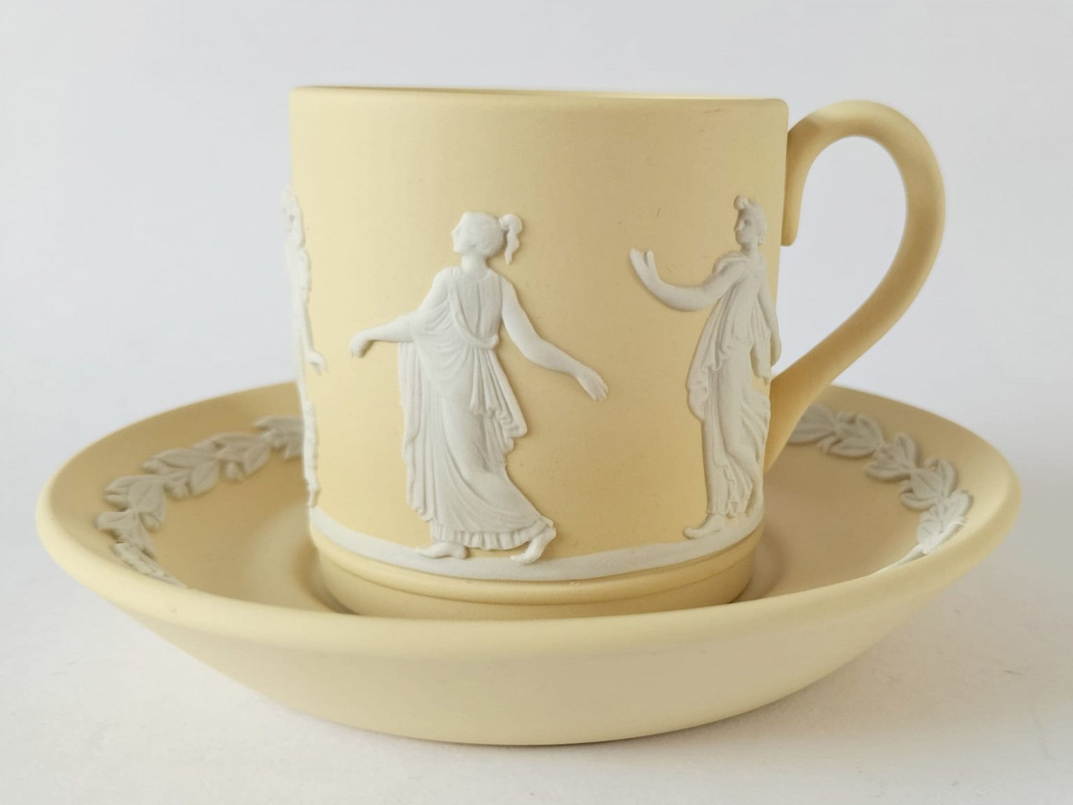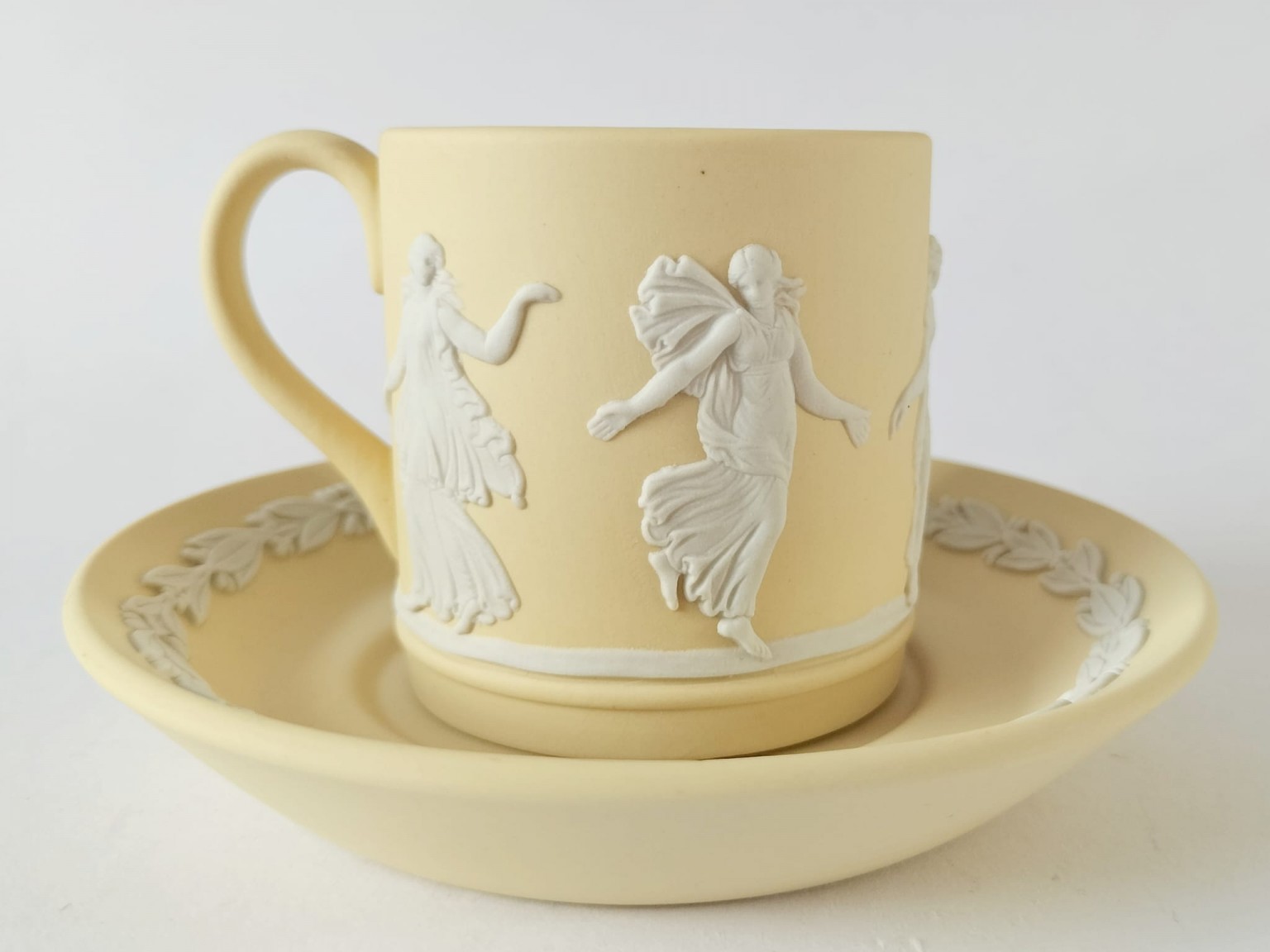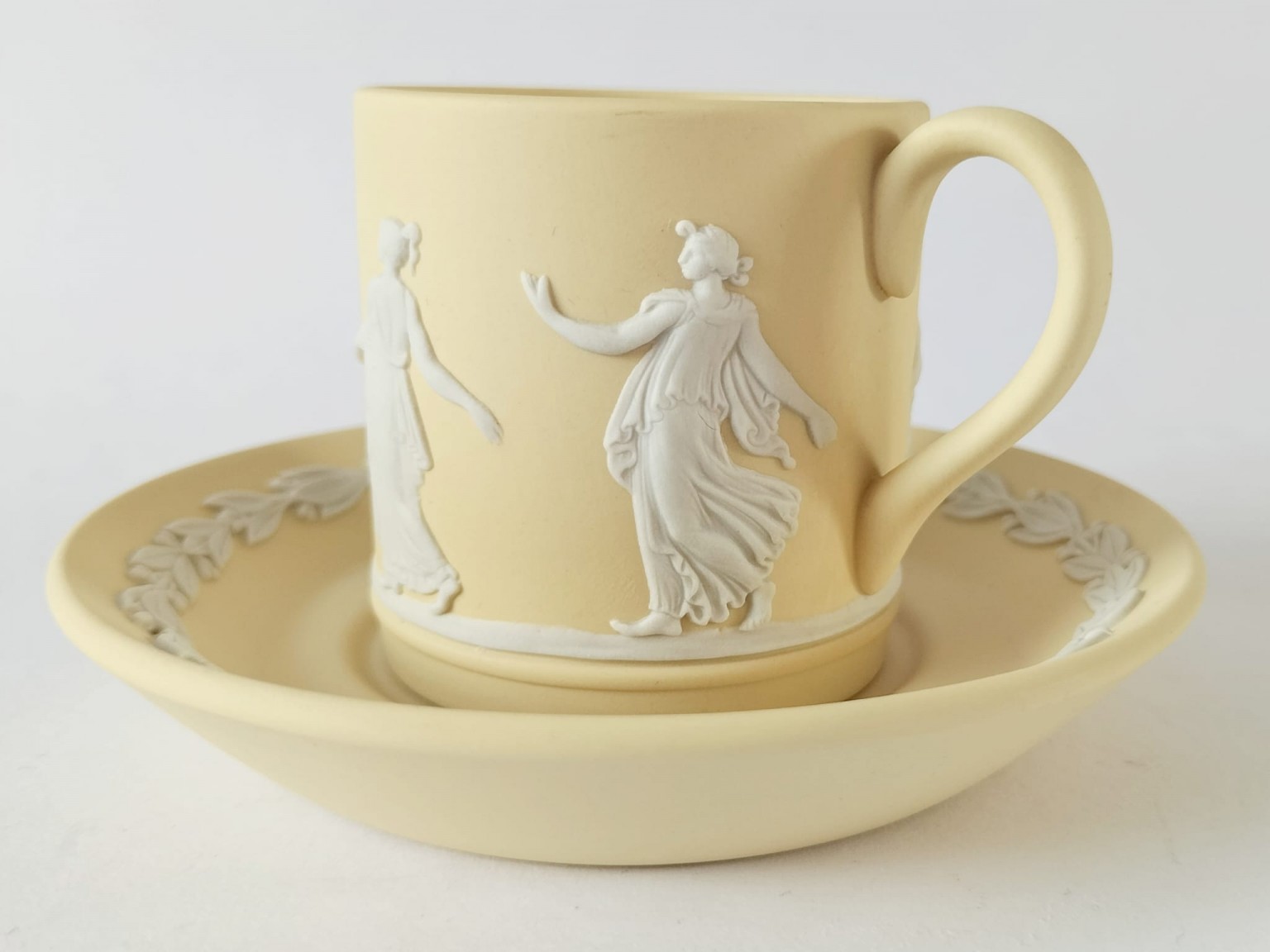 A Wedgwood primrose yellow Jasperware coffee cup and saucer. The cup features white bas-reliefs of Dancing Hours ladies around the outside.