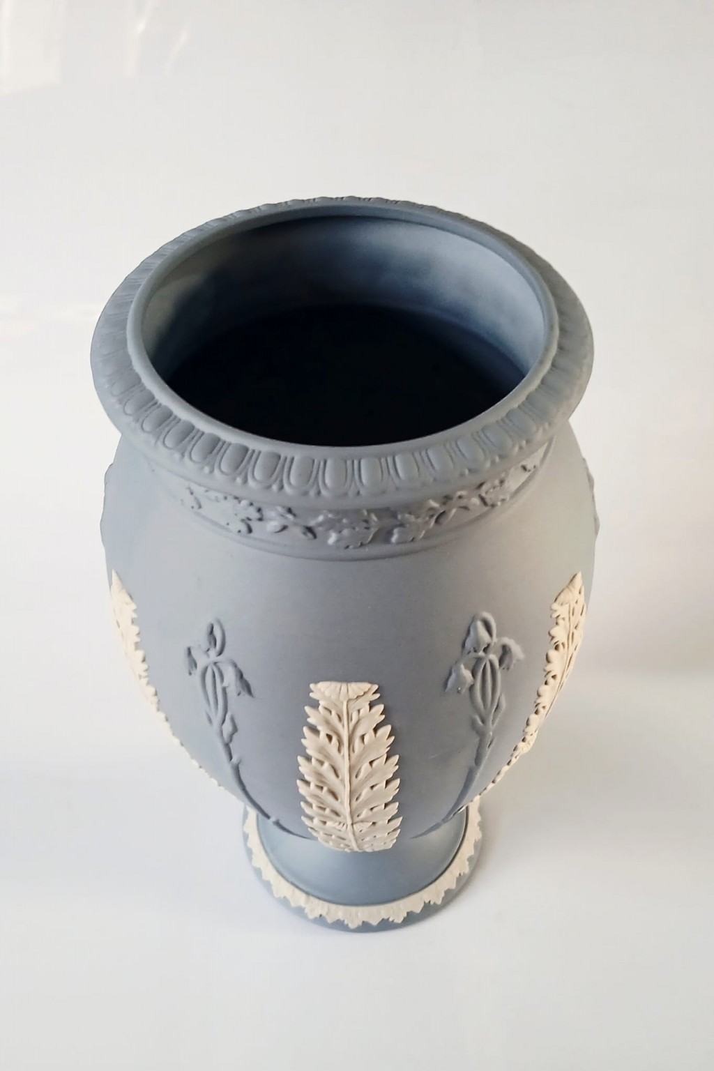 A Wedgwood blue jasperware vase featuring Acanthus and Bellflowers on the outside.