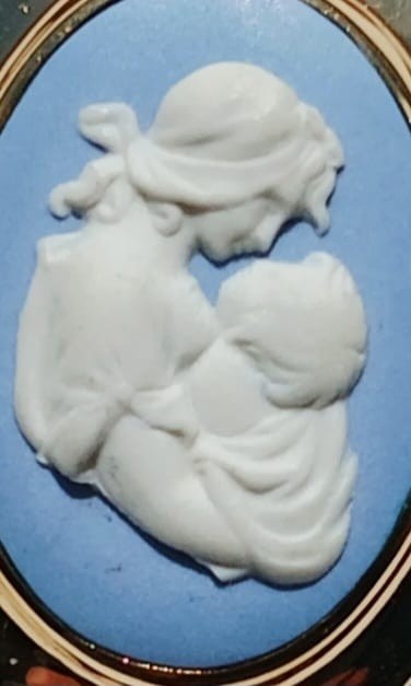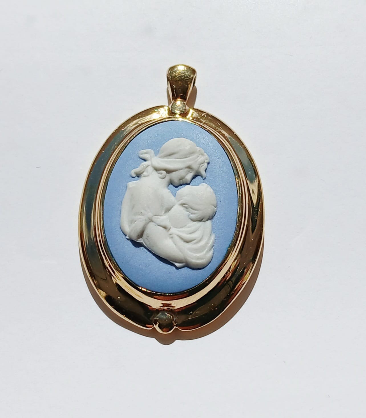 A Wedgwood blue Jasperware pendant with a white bas-relief of a Mother and Child set in a gold coloured mount.
