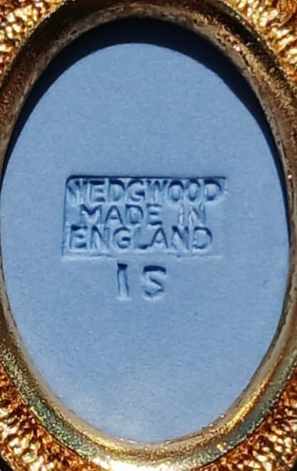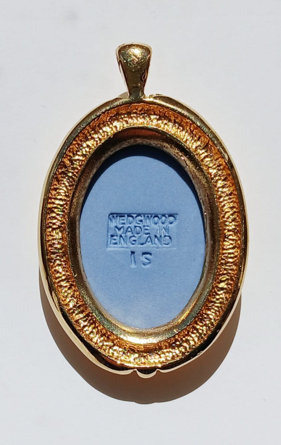 The pendant measures approximately 1 1/4 inches by 1 inch and is impressed on the back Wedgwood made in England.