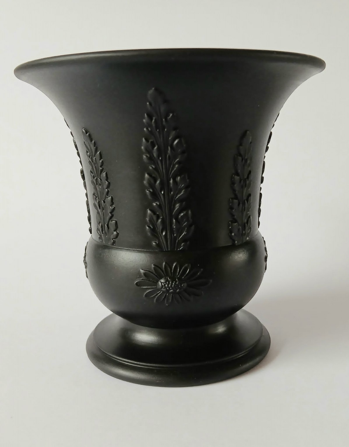 A Wedgwood basalt flared vase featuring bulrushes and flowers around the outside.