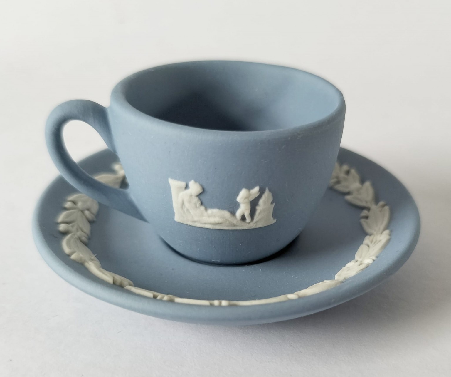 A Wedgwood blue Jasperware miniature cup and saucer both with a white bas-relief.
