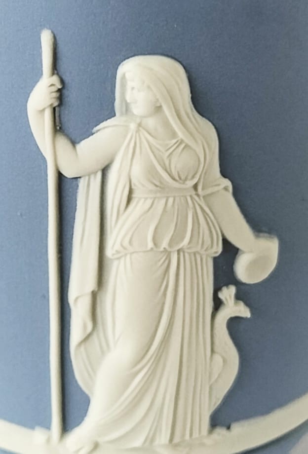 A Wedgwood blue jasperware footed vase with white bas-reliefs depicting Cupid and Psyche.