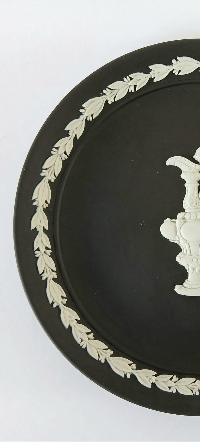 A Wedgwood black jasperware plate featuring a white bas-relief of The American's Cup trophy.