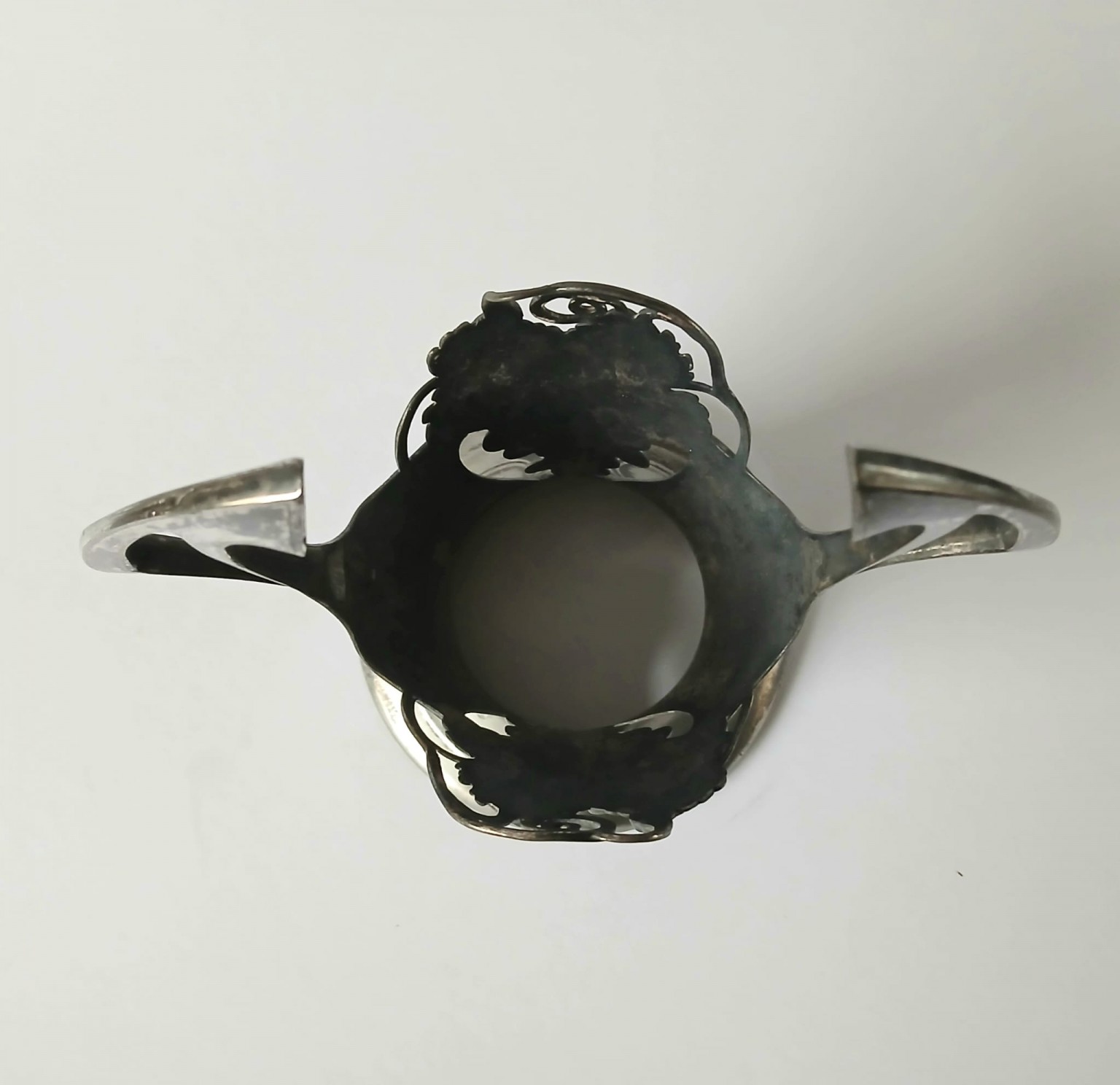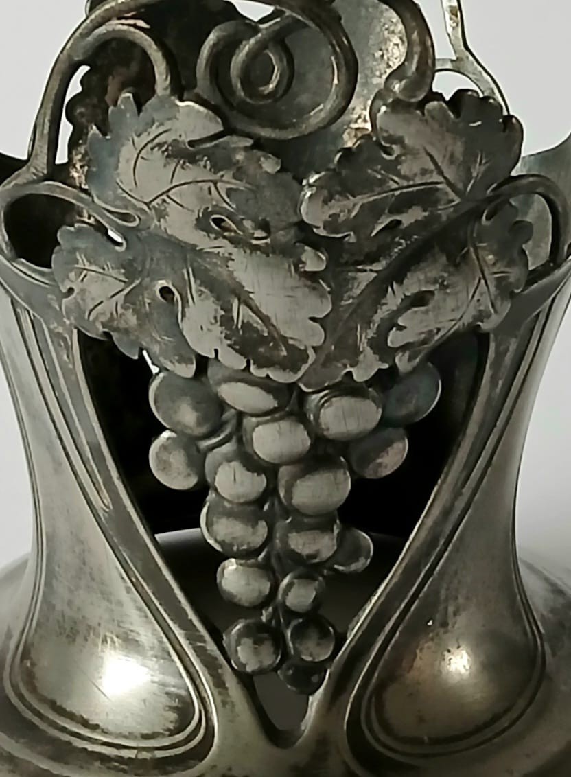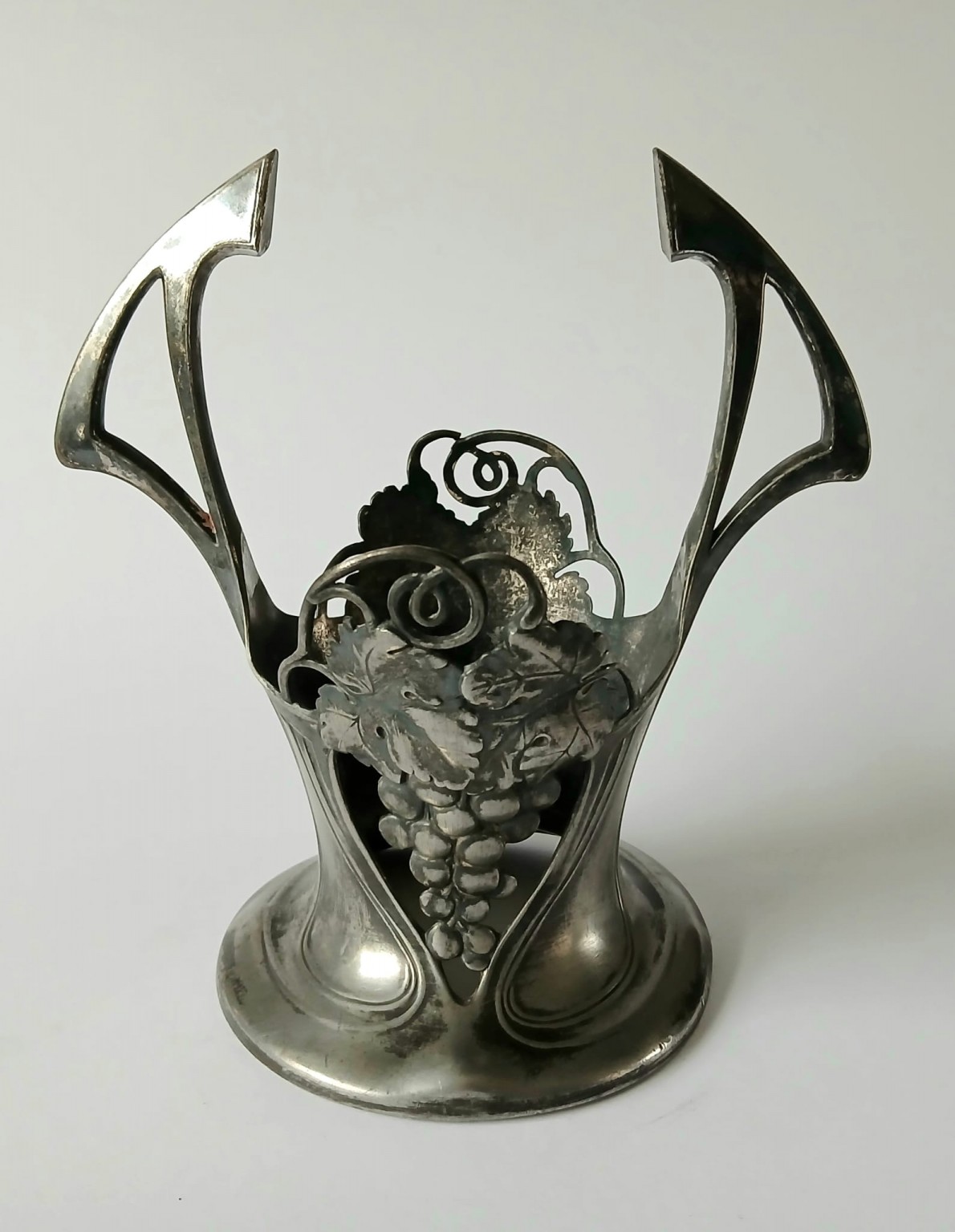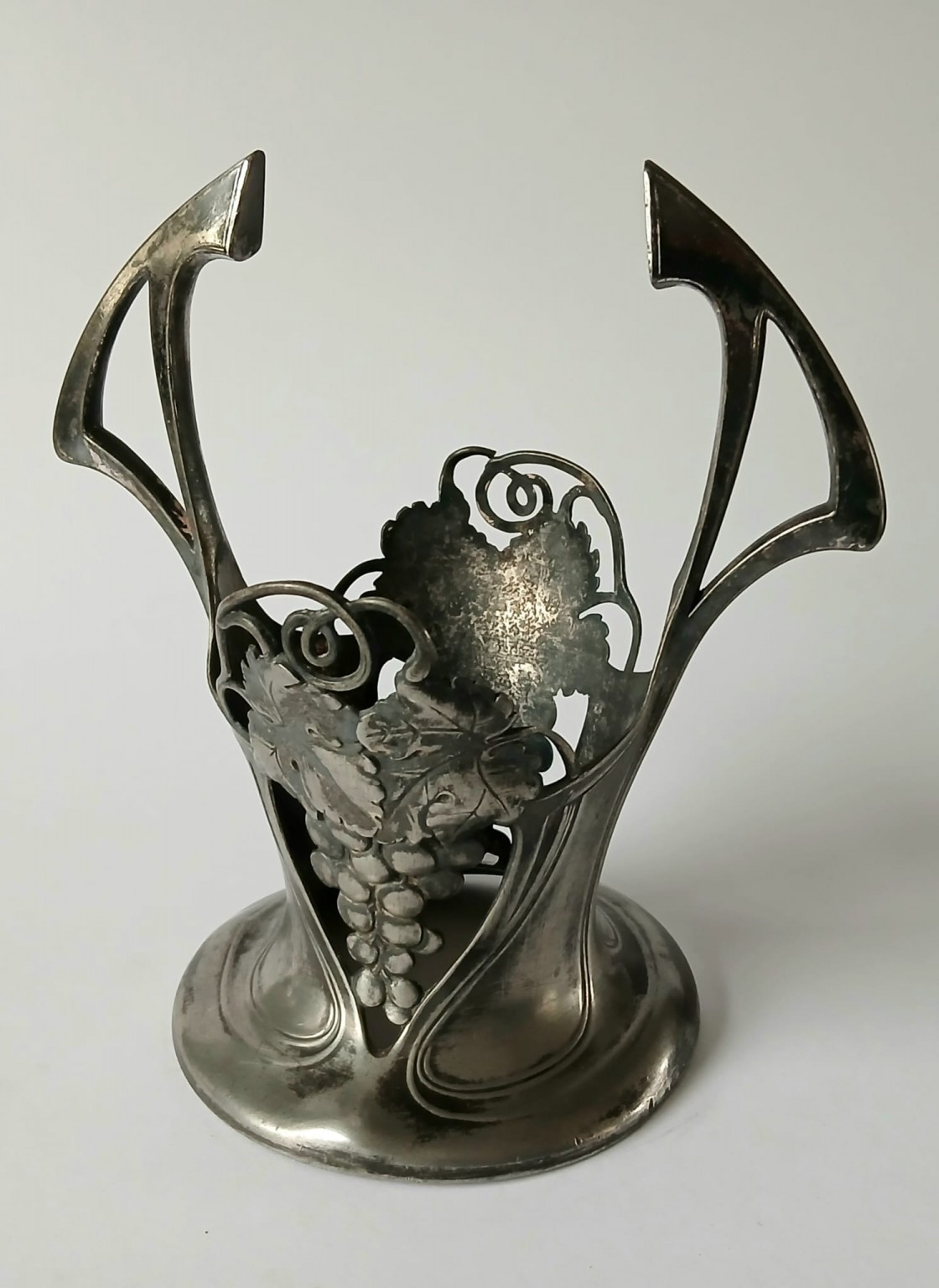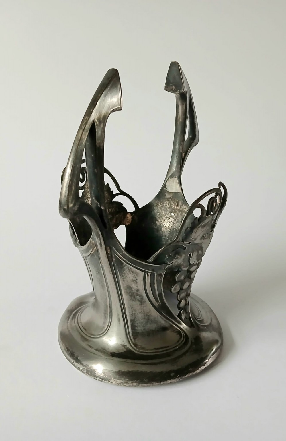 An Art Nouveau metal celery stand holder with grape decoration to each side.