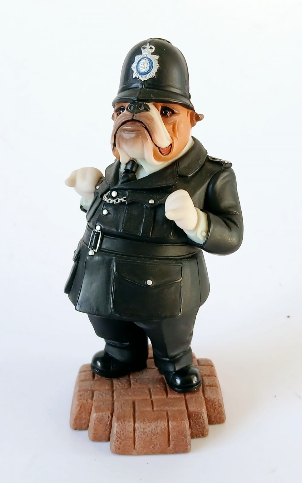 A Doggie People figurine of a Bulldog dressed as a policeman entitled 'Allo, Allo! DP135' by Robert Harrop Designs.