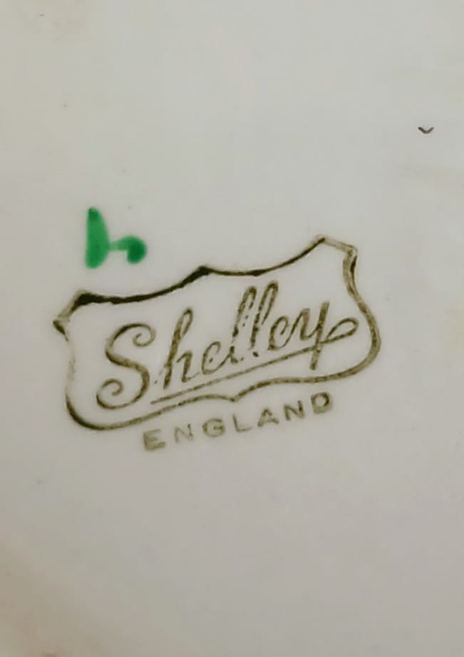 The vase measures approximately 3 1/2 inches in diameter and stands around 6 1/2 inches tall. The vase is stamped 'Shelley England' on its base.