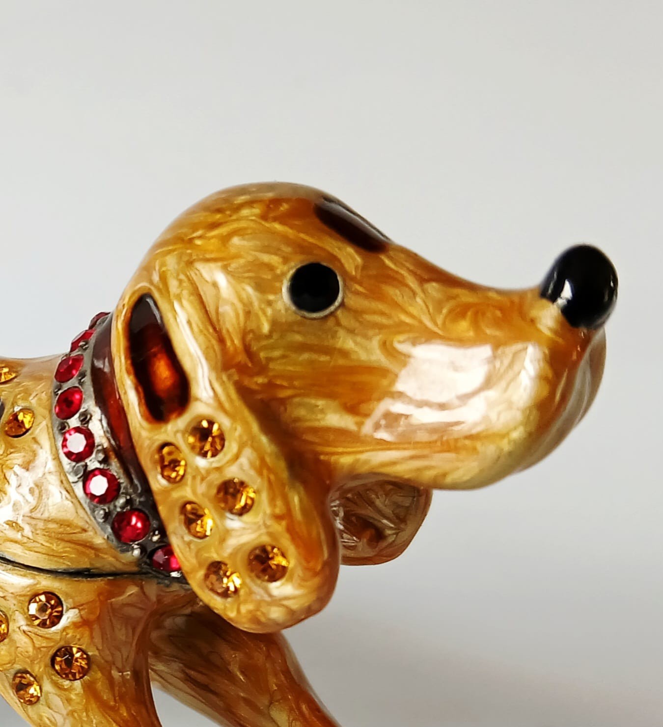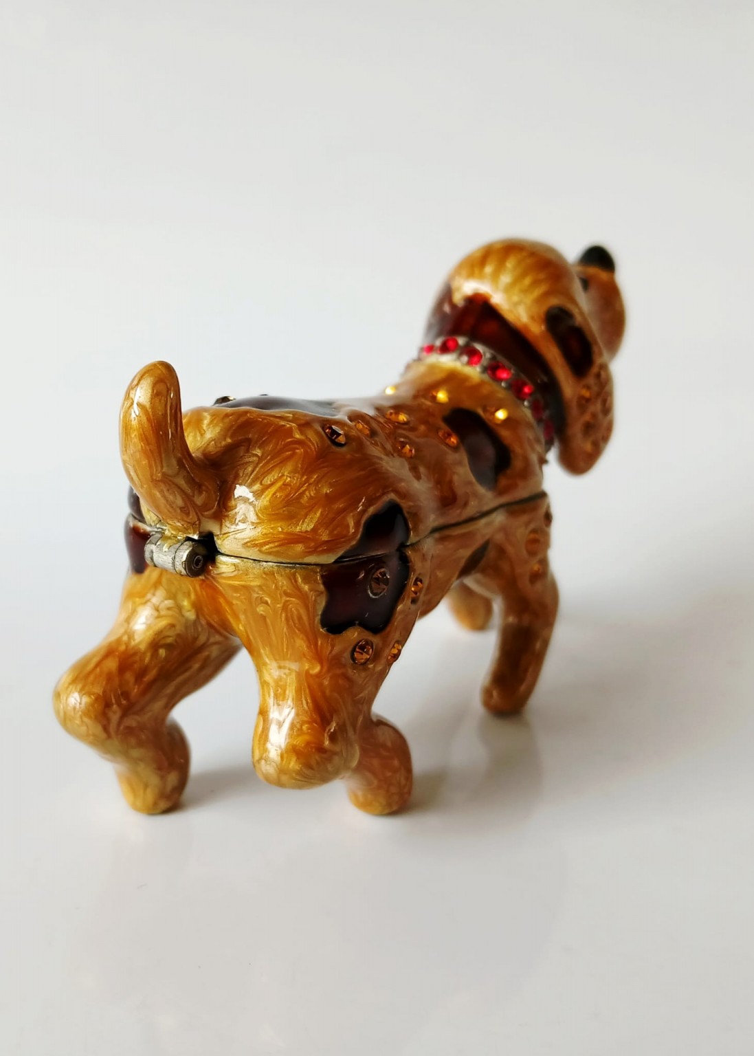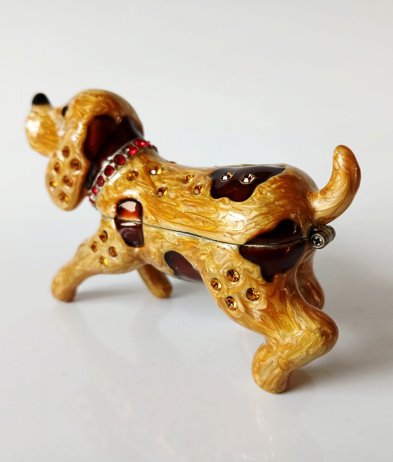 A heavy ornate metal and enamel trinket box in the shape of a dog with spots, long ears and wearing a red collar.