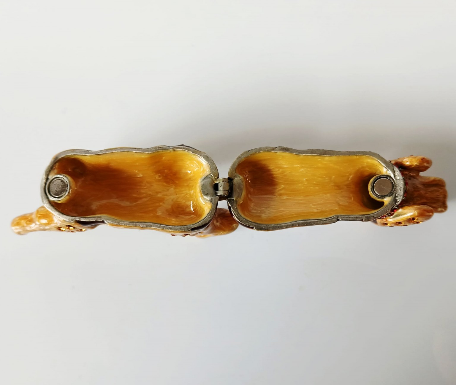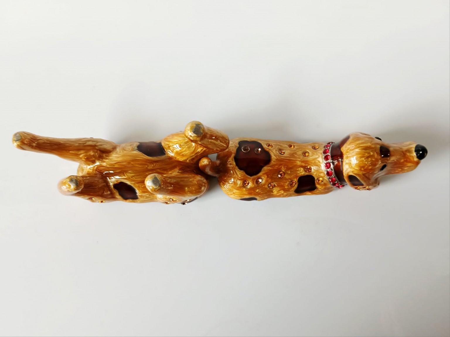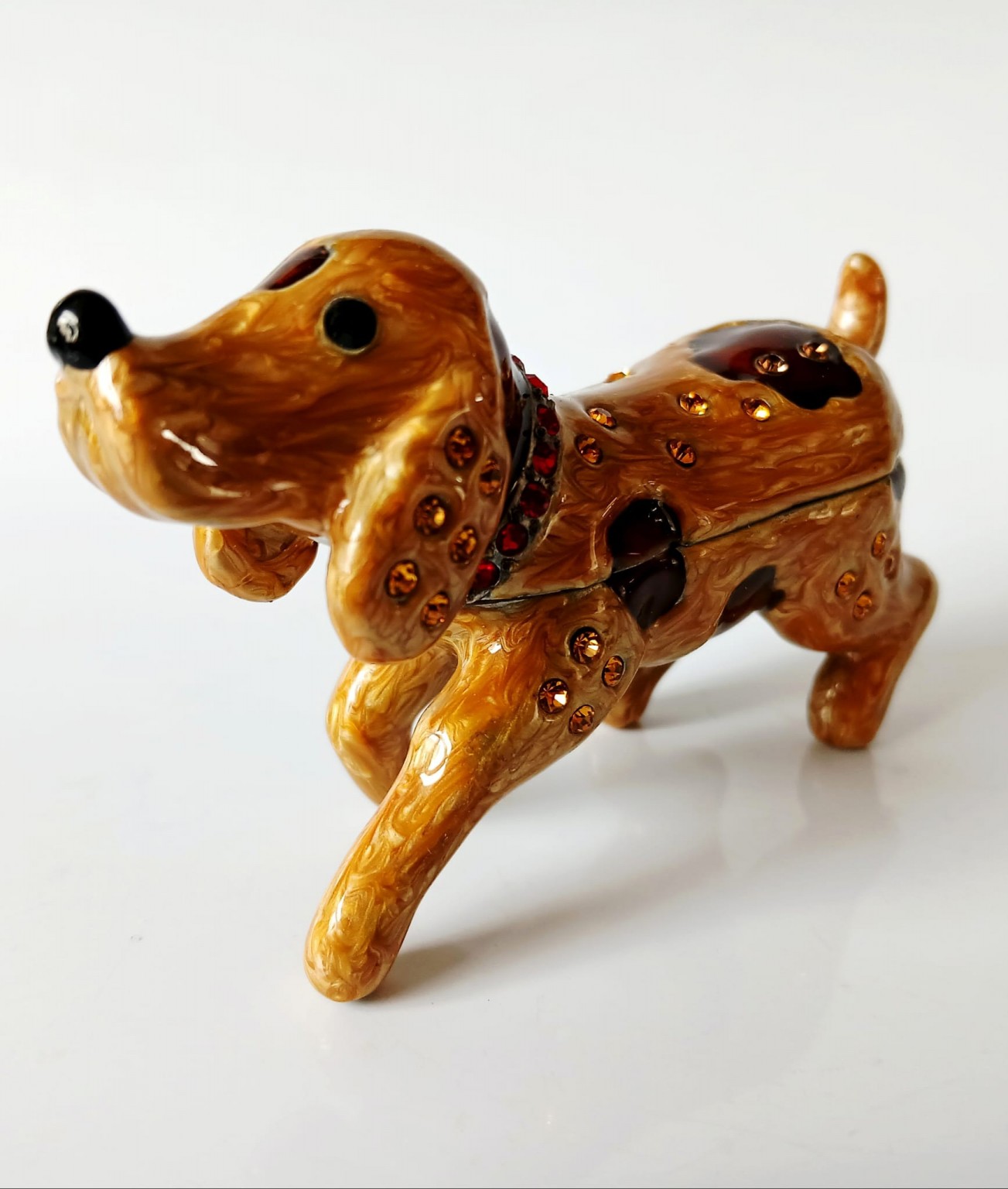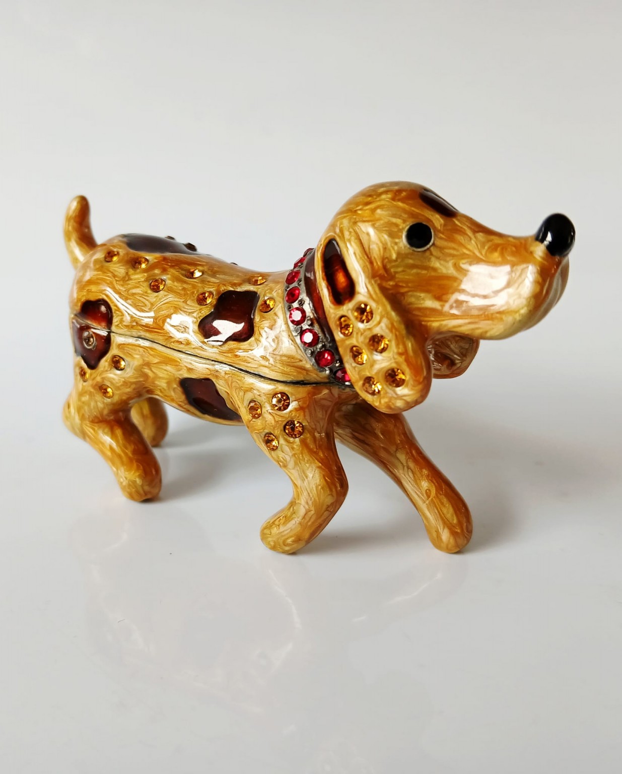 A heavy ornate metal and enamel trinket box in the shape of a dog with spots, long ears and wearing a red collar.
