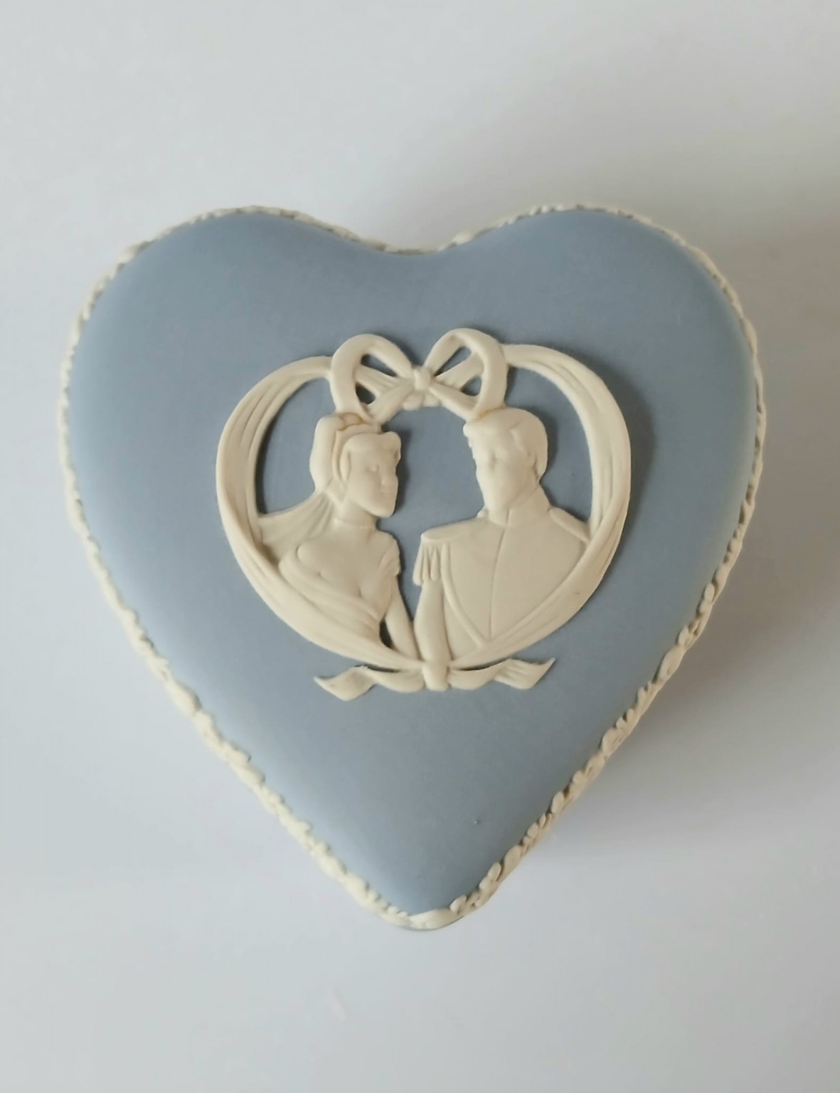 A Wedgwood blue jasperware trinket box with a white bas-relief of Cinderella and Prince Charming to the lid and bells to the sides.