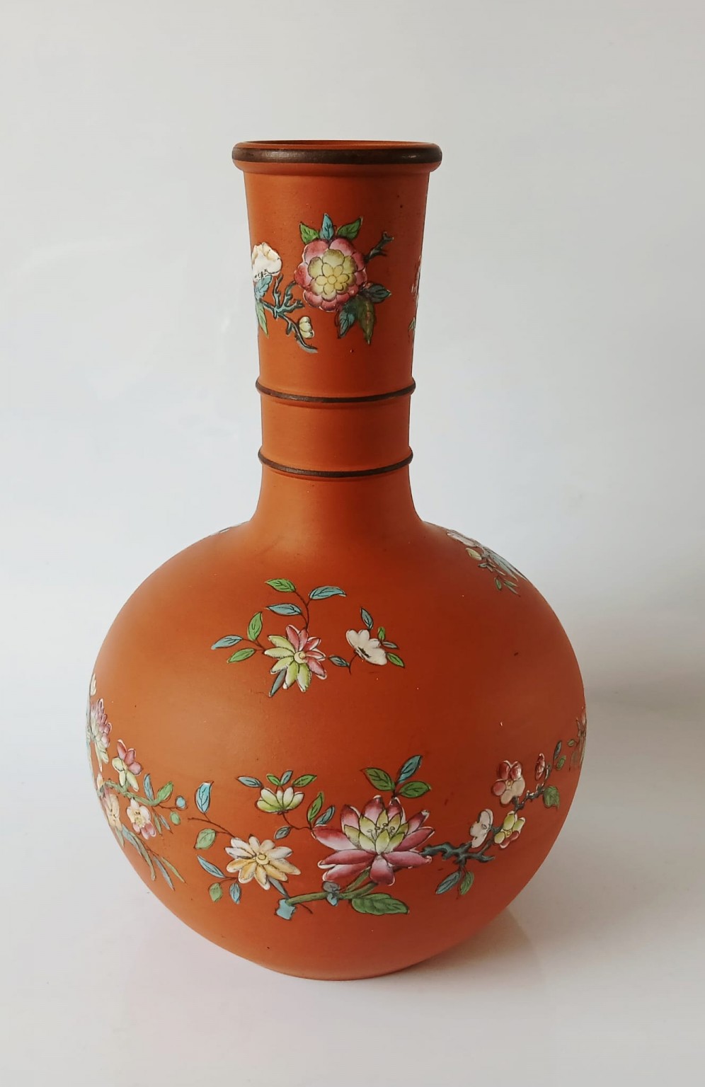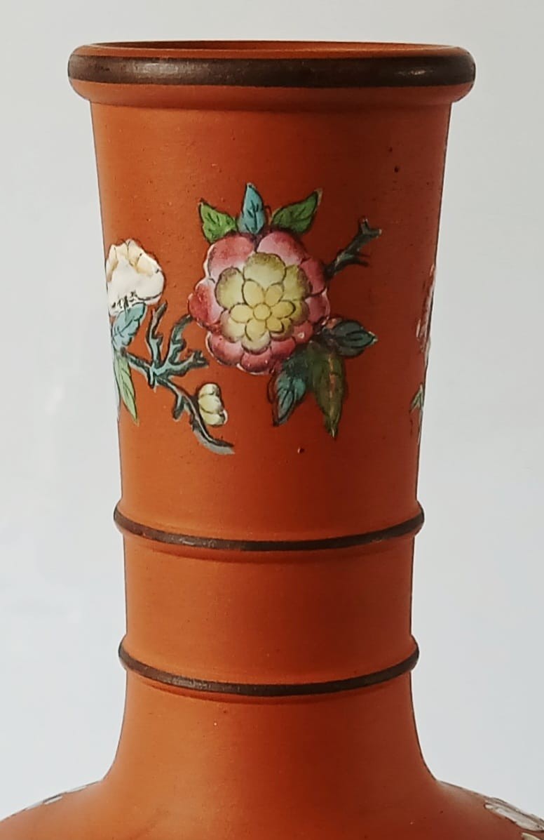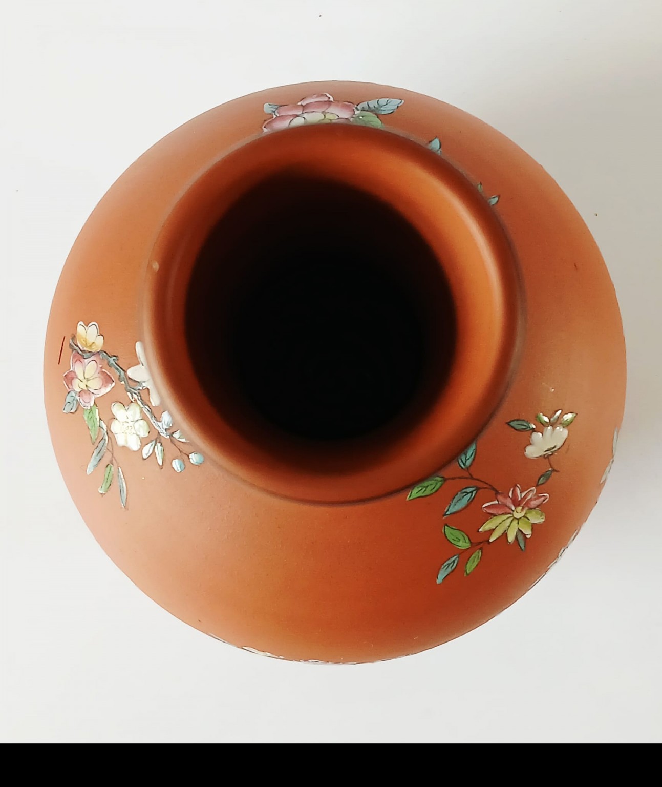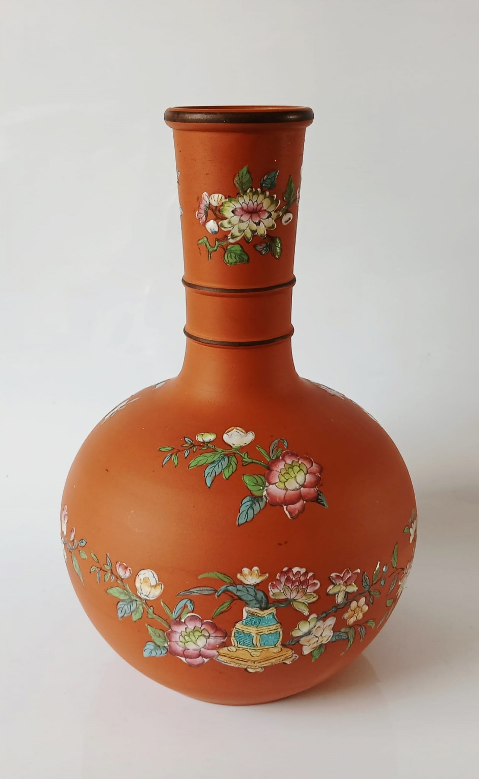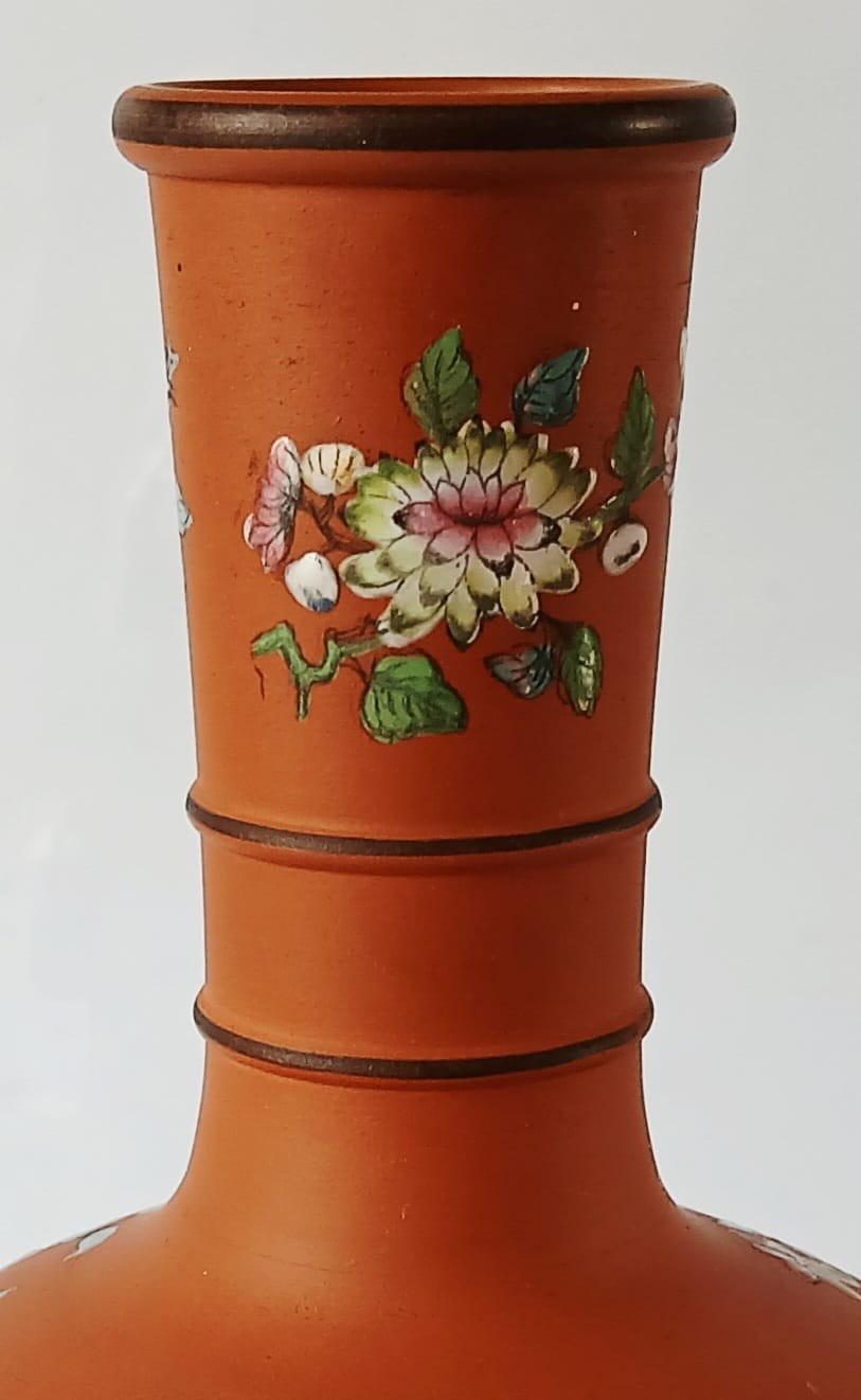 An early terracotta ware vase with a floral enamel design possibly Antico Rosso.