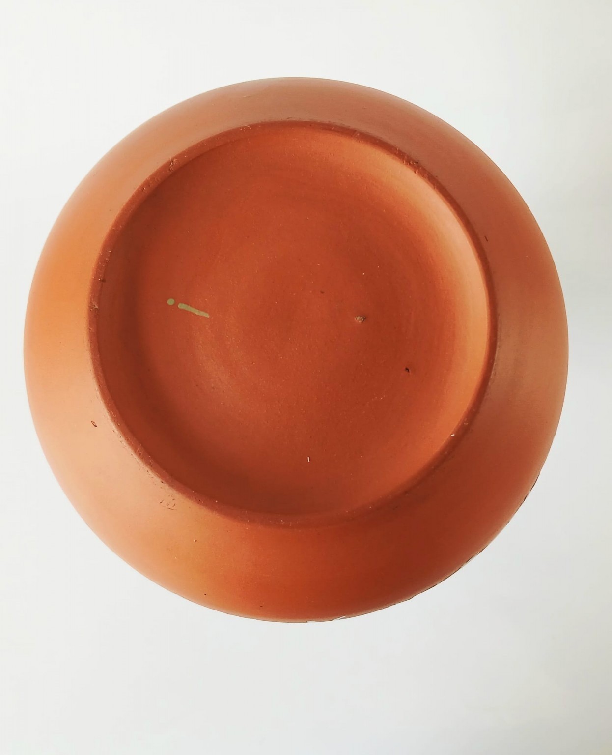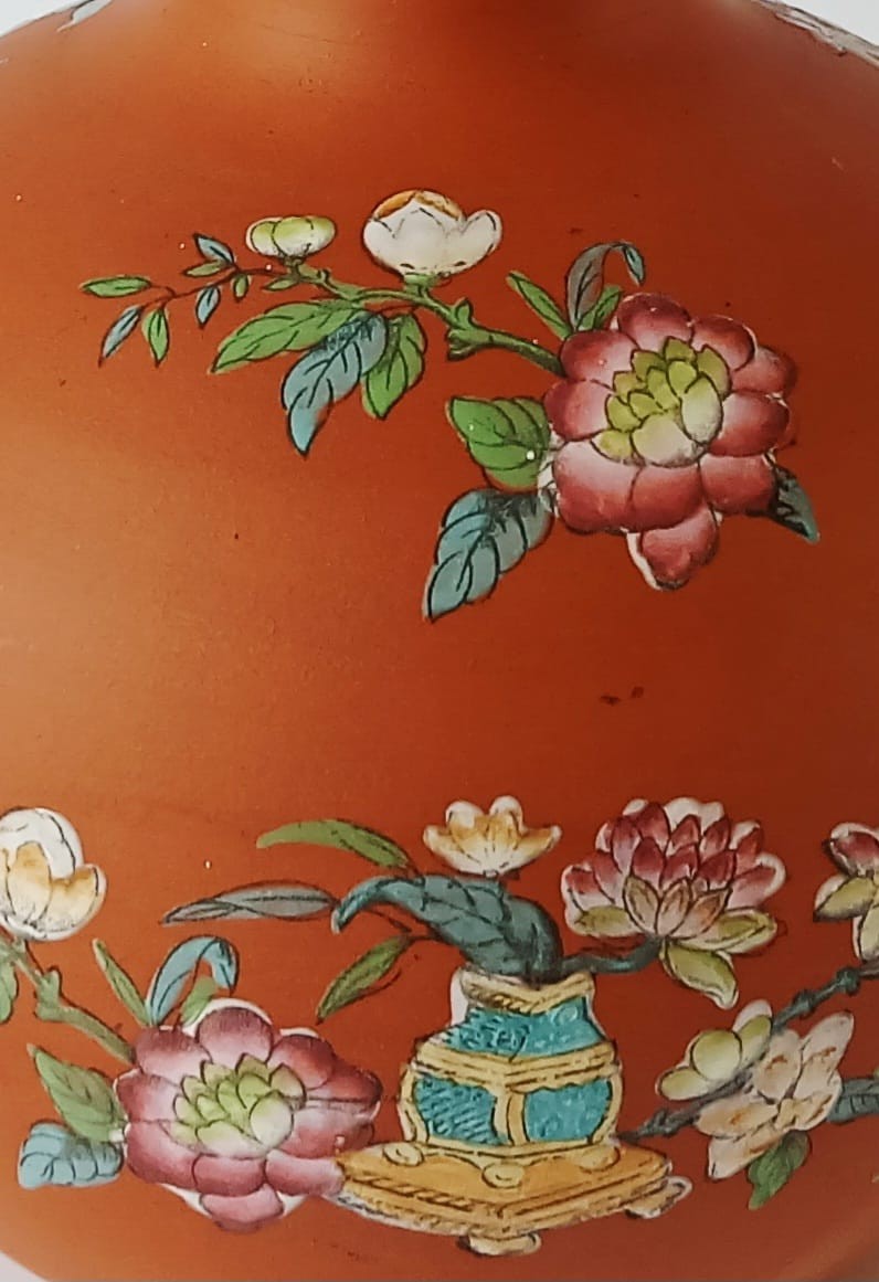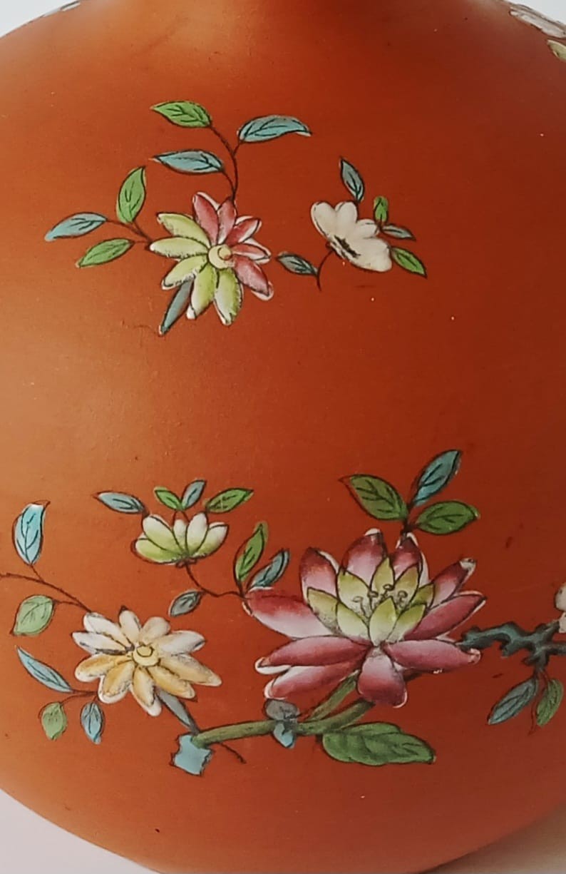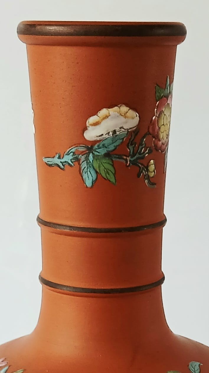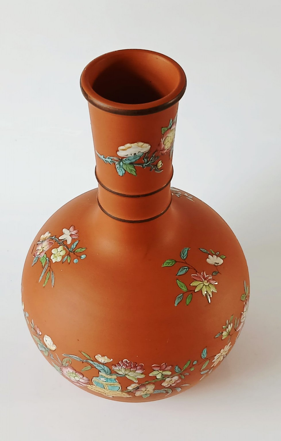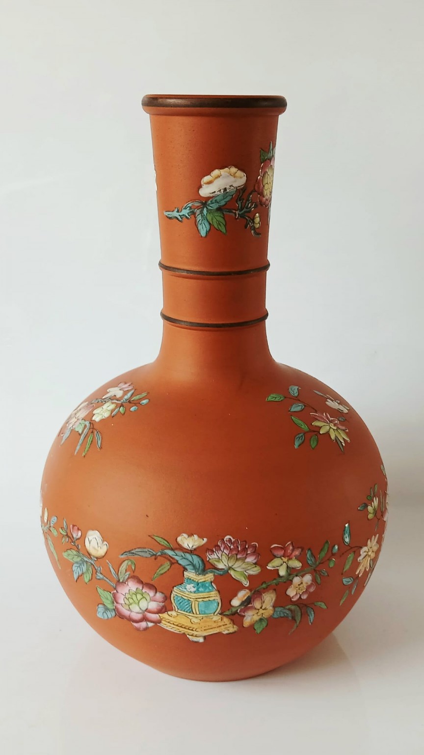 An early terracotta ware vase with a floral enamel design possibly Antico Rosso.