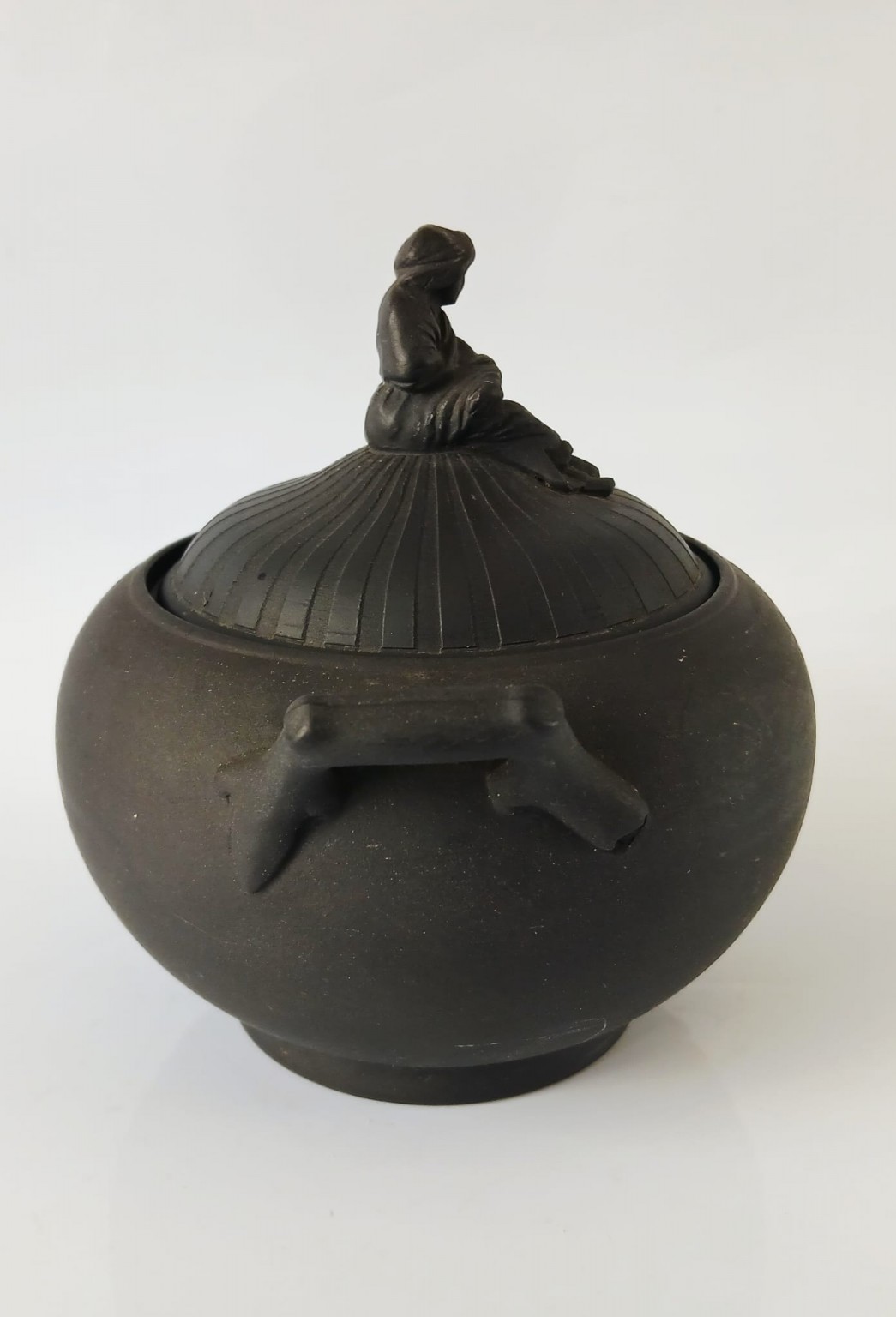 A Wedgwood basalt sugar pot and engine turned lid with a Sybil finial.