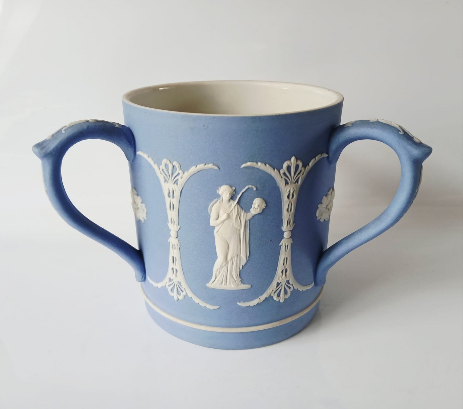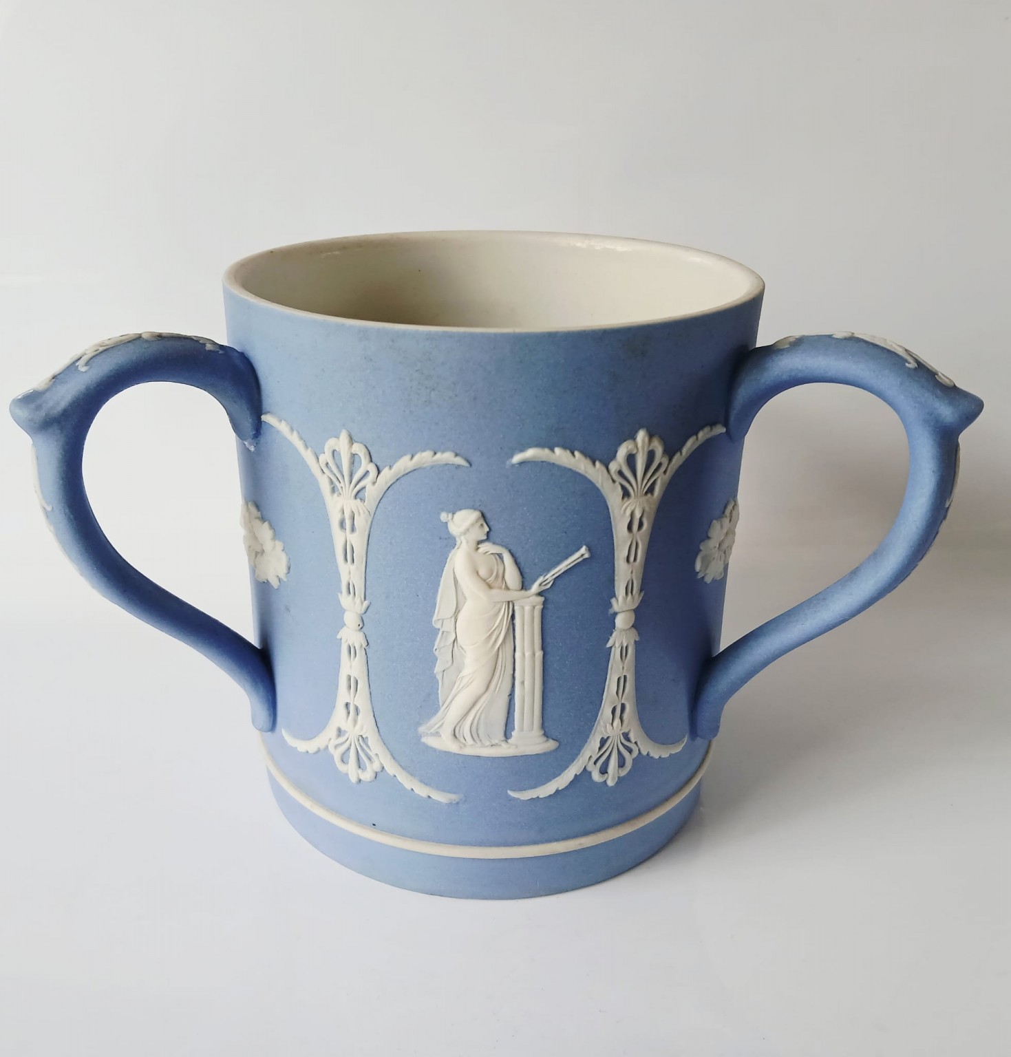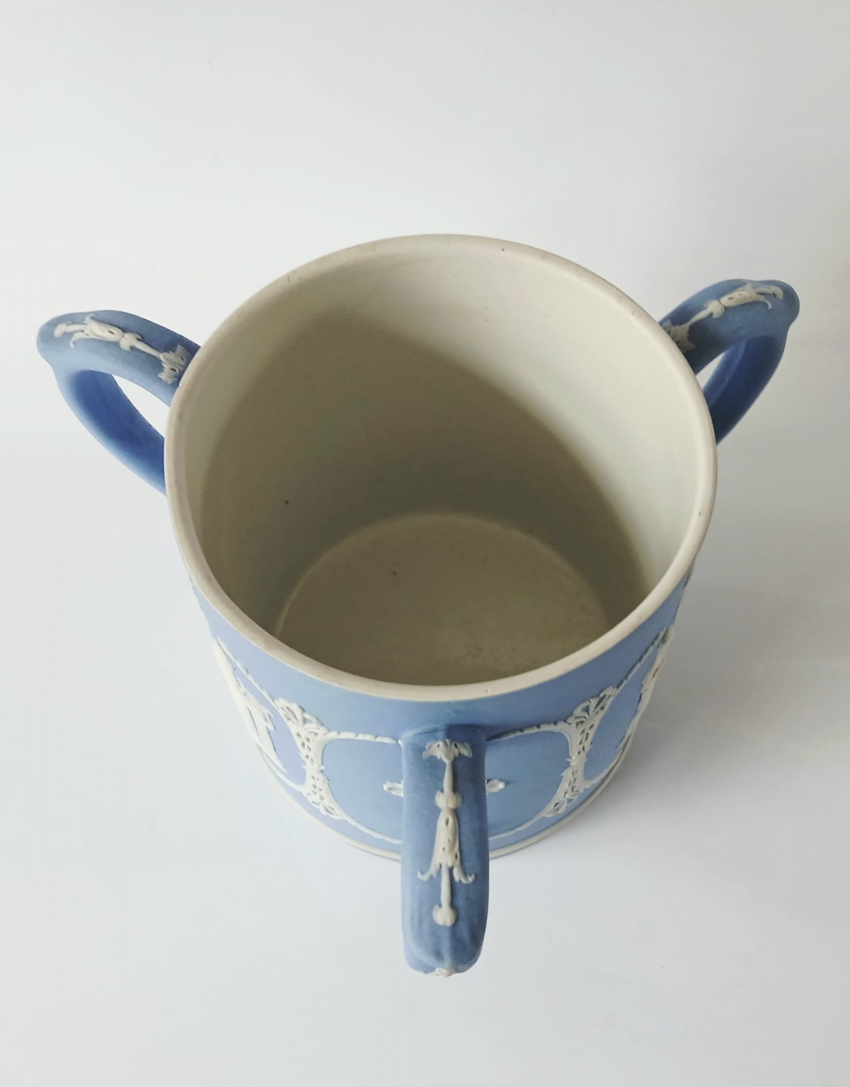 An antique Wedgwood pale blue dip jasperware three handled loving mug with white bas-reliefs of classical muse figures.