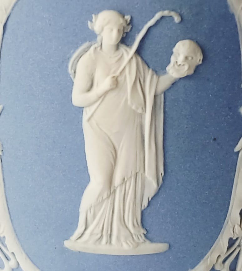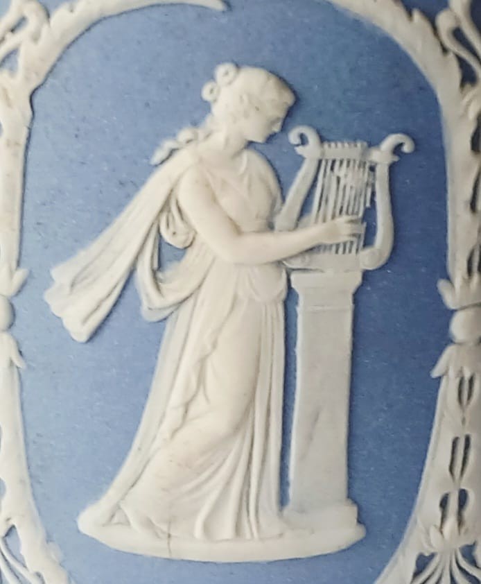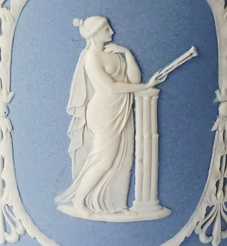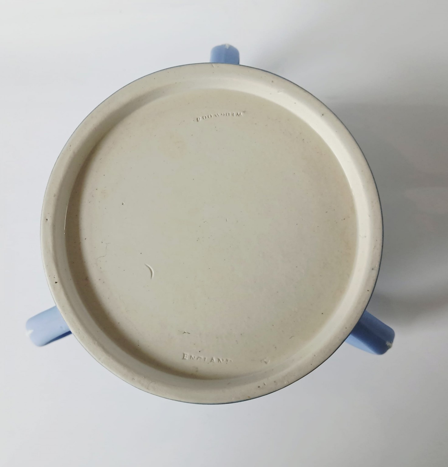 An antique Wedgwood pale blue dip jasperware three handled loving mug with white bas-reliefs of classical muse figures.