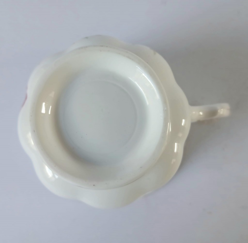 The tea cup measures approximately 3 1/2 inches in diameter and stands 2 3/4 inches tall and has more flowers decorating the inside together with the word August. The saucer measures approximately 5 1/2 inches in diameter.