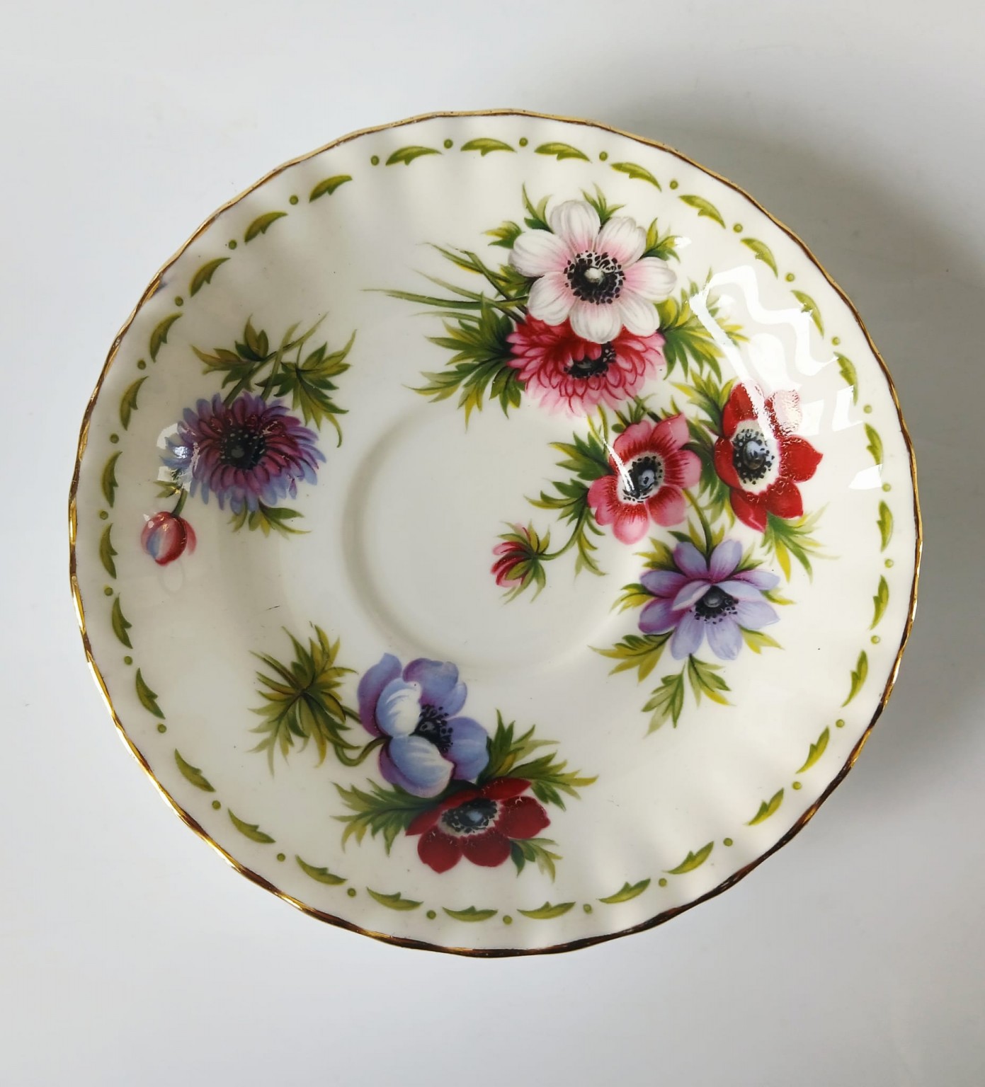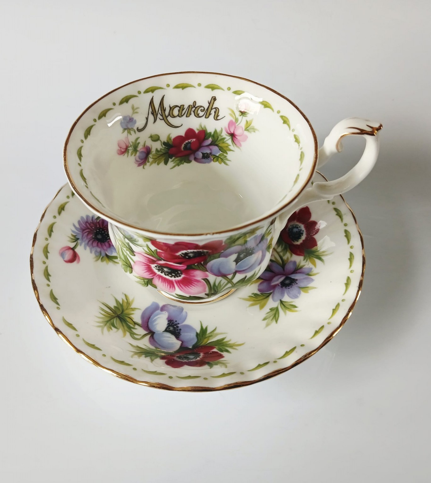 A very pretty tea cup and saucer from the Flower of the Month Series produced by Royal Albert featuring the month of March and Anemones.