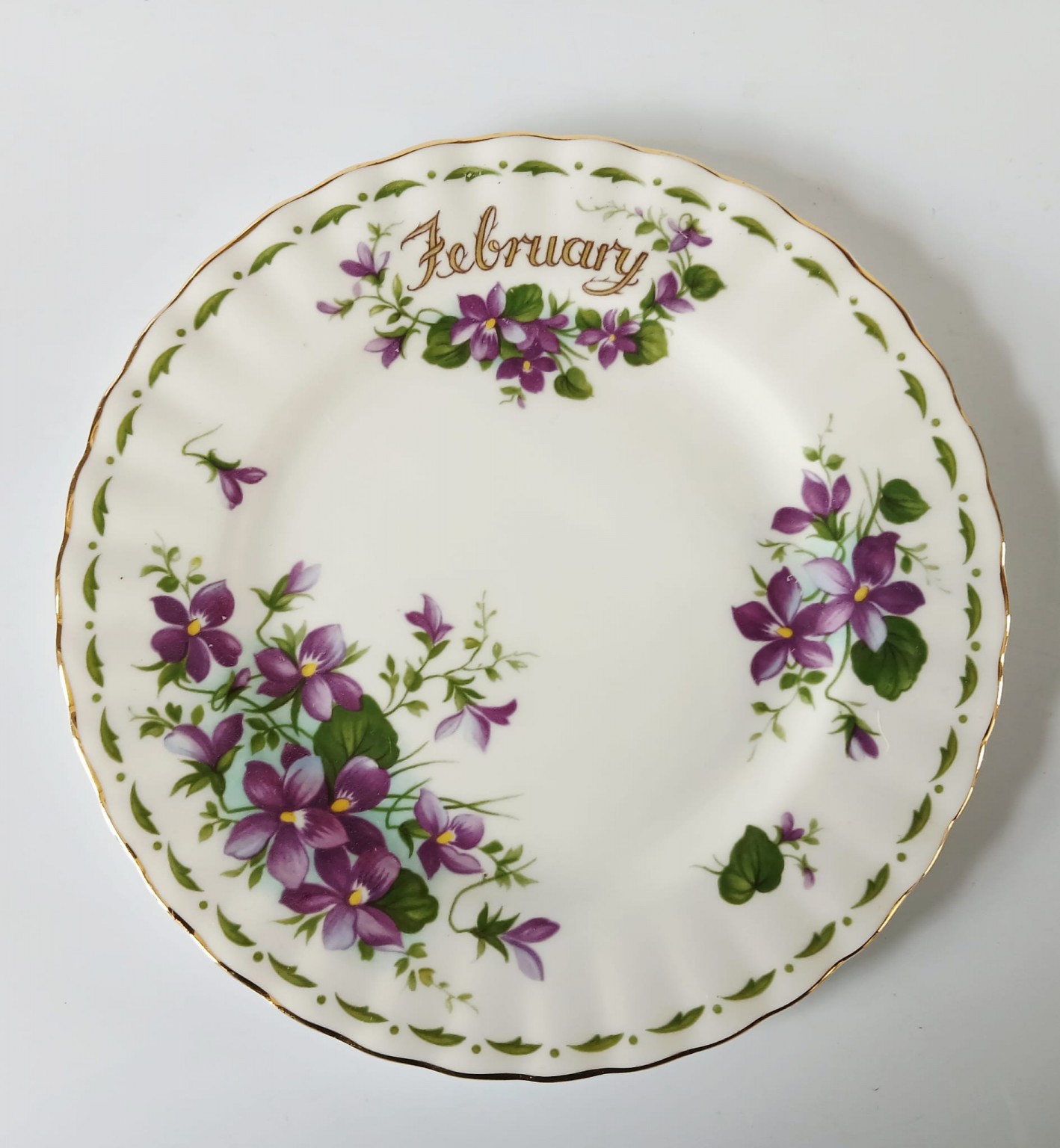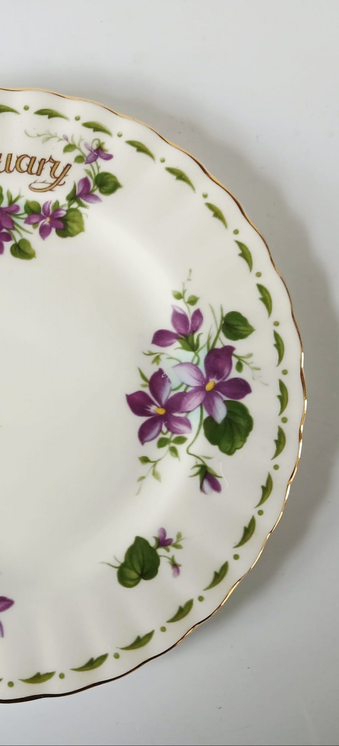 A tea plate from the Flower of the Month Series produced by Royal Albert featuring the month of February and the Violets flower.