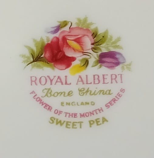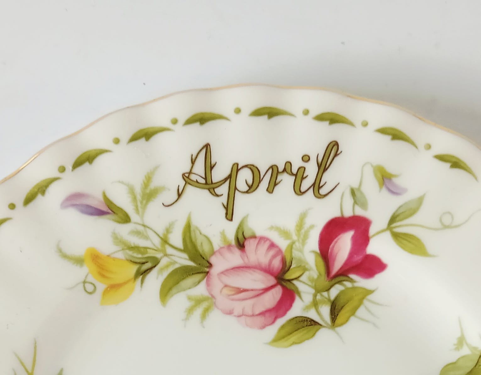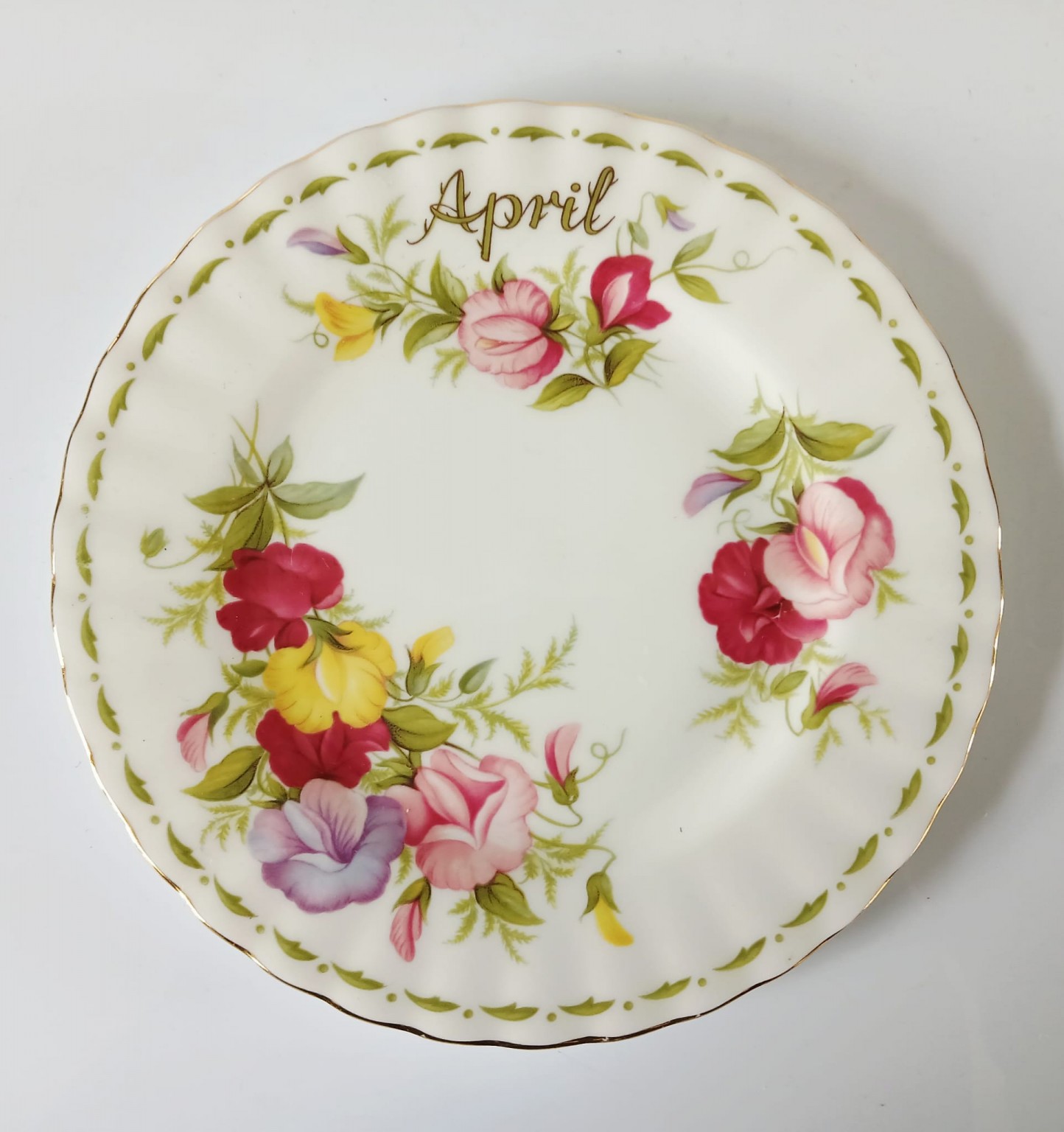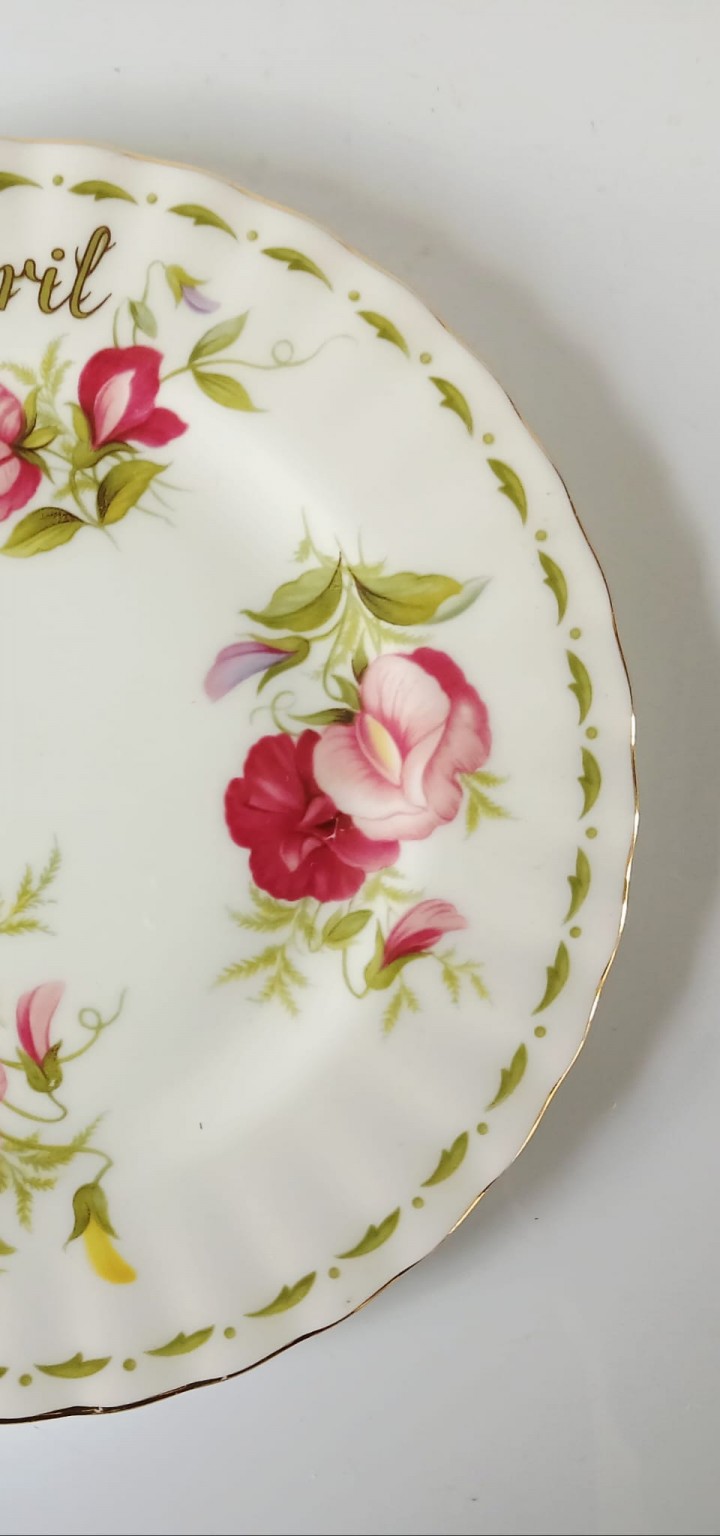 A tea plate from the Flower of the Month Series produced by Royal Albert featuring the month of April and the Sweet Pea flower.