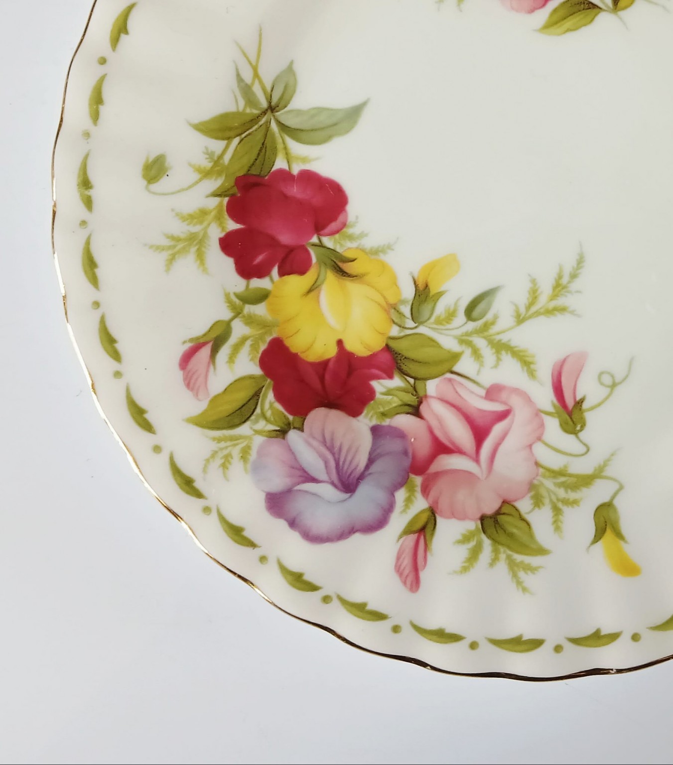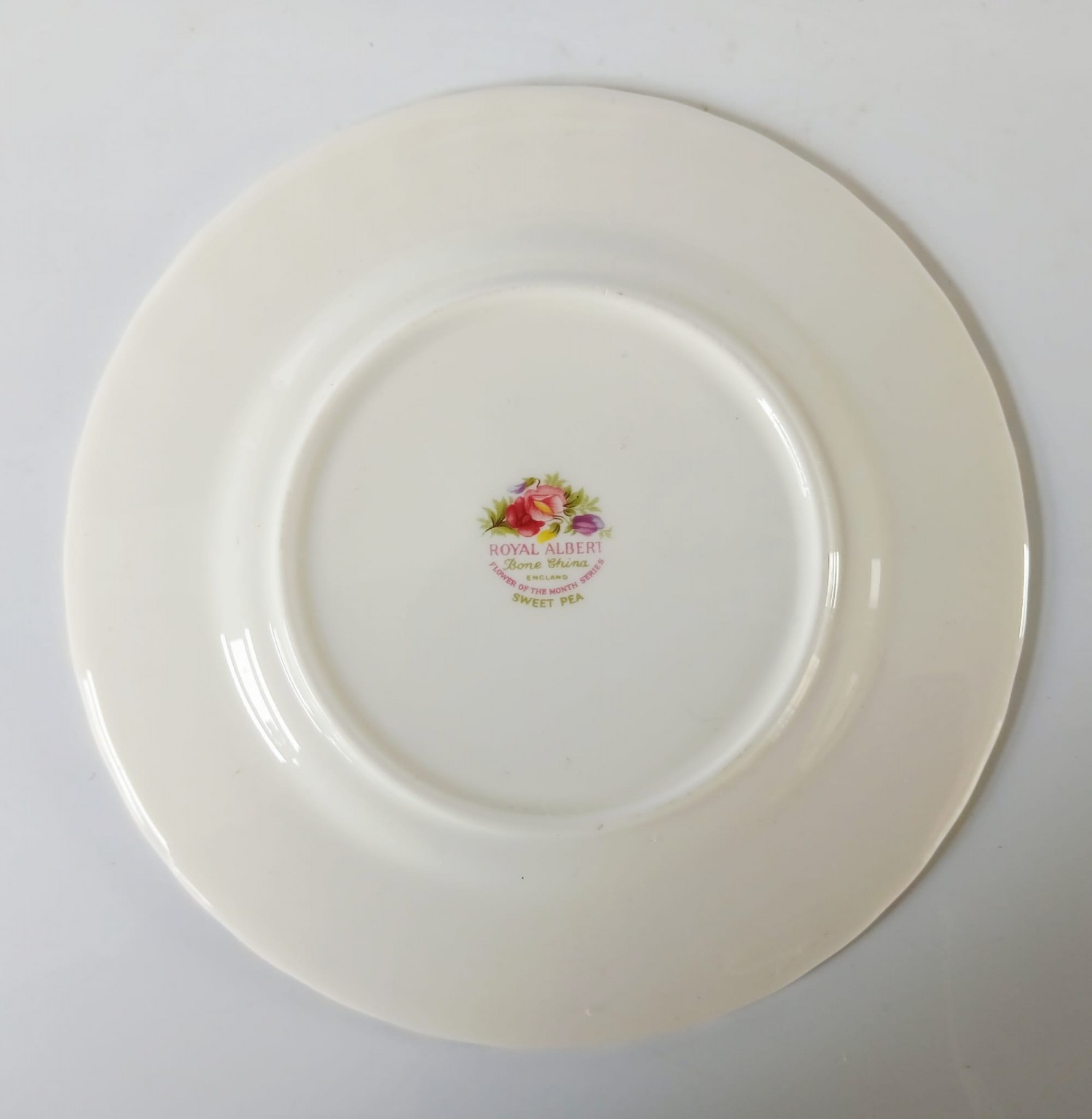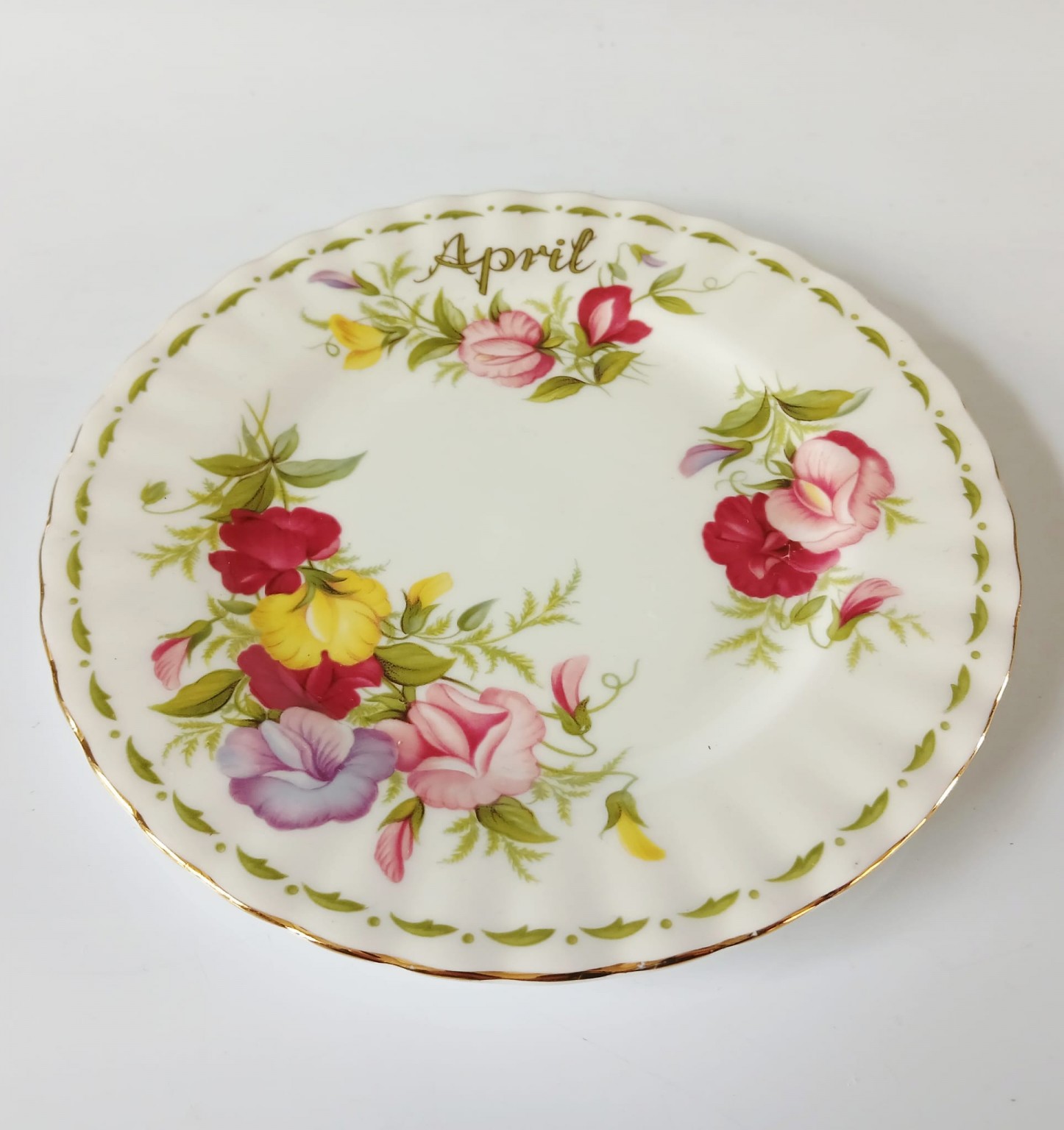 A tea plate from the Flower of the Month Series produced by Royal Albert featuring the month of April and the Sweet Pea flower.