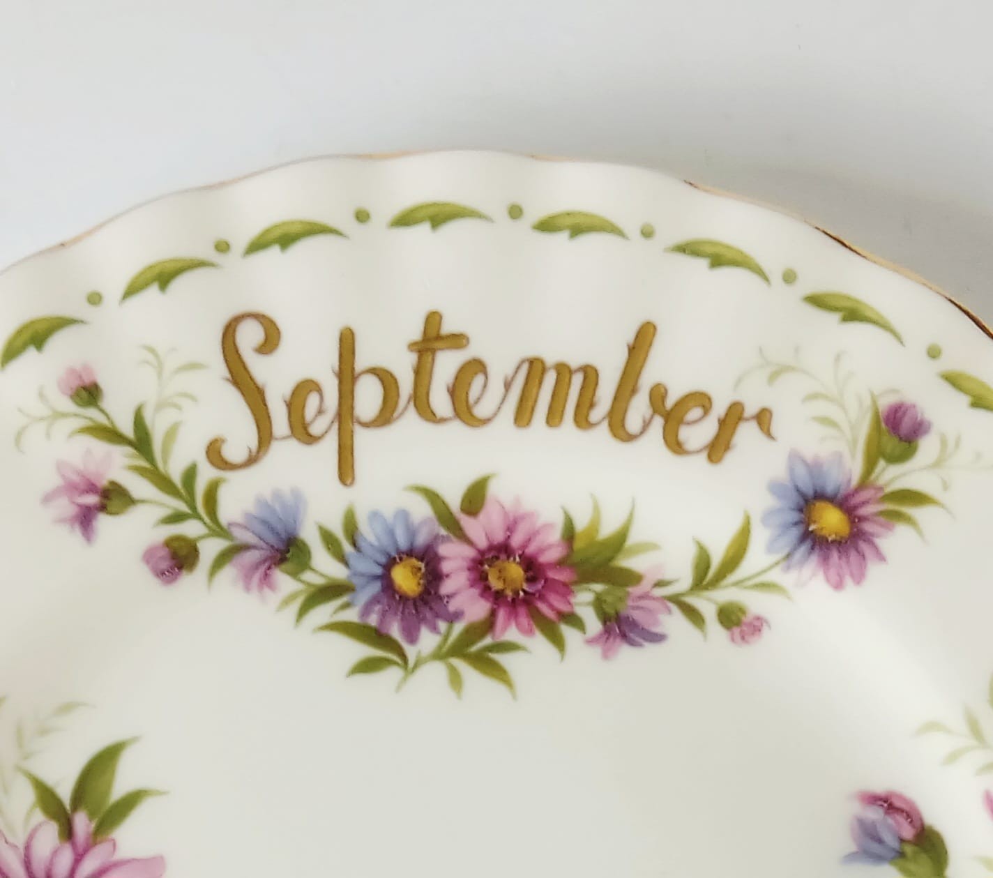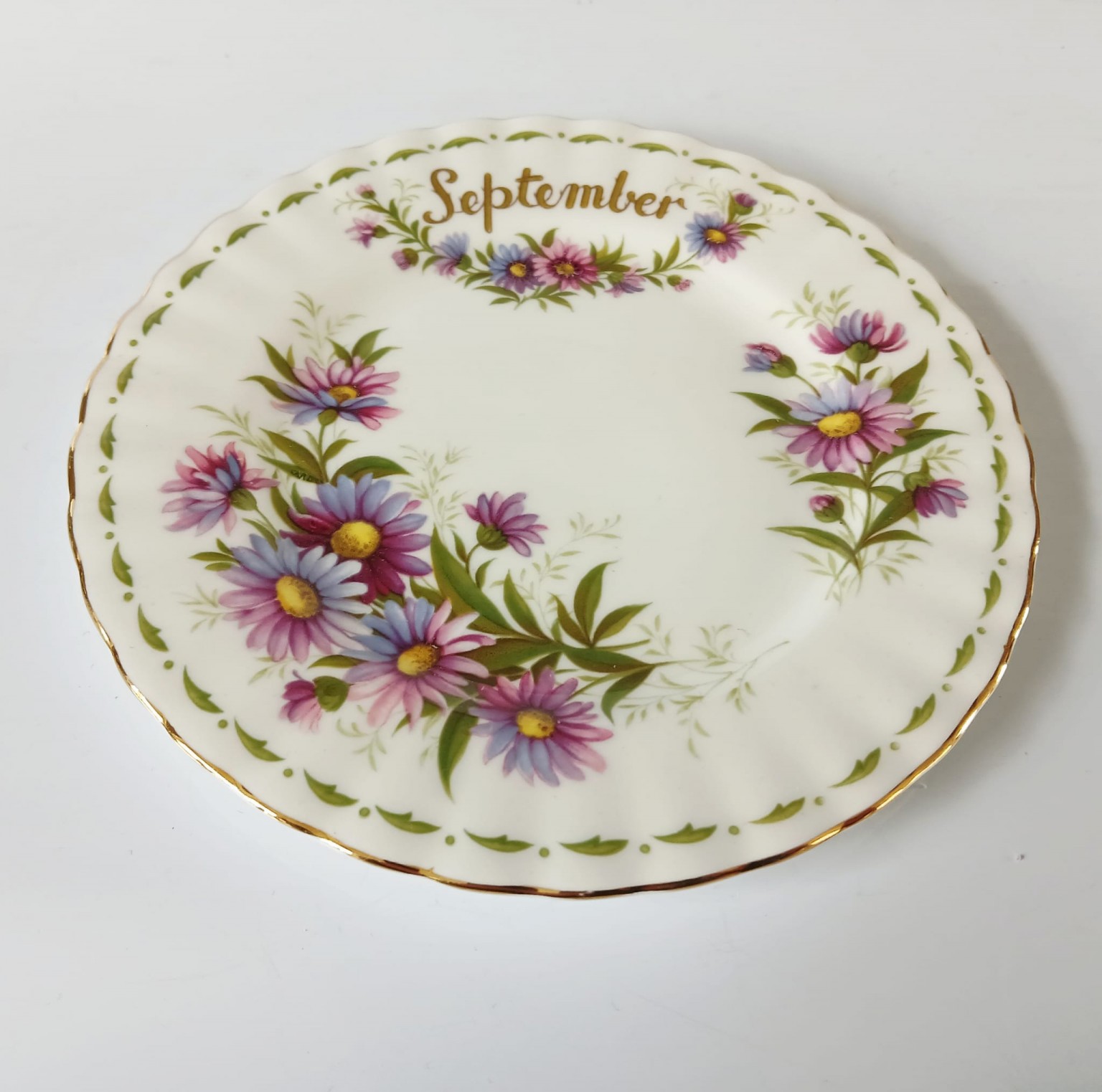 A tea plate from the Flower of the Month Series produced by Royal Albert featuring the month of September and the Michaelmas Daisy flower.