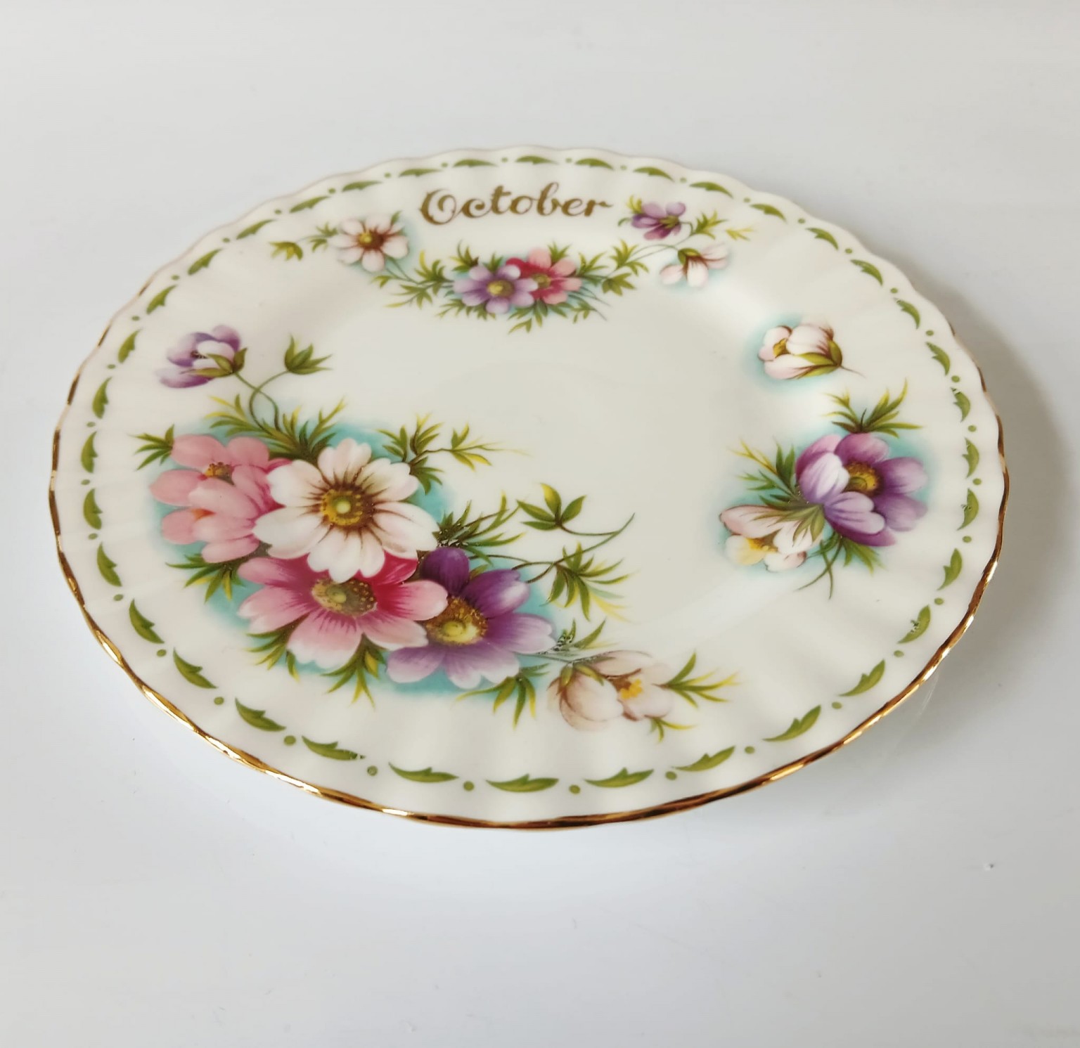 A tea plate from the Flower of the Month Series produced by Royal Albert featuring the month of October and the Cosmos flower.