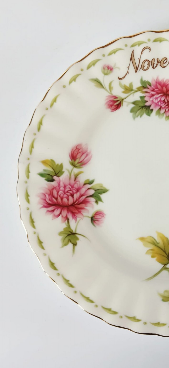 A tea plate from the Flower of the Month Series produced by Royal Albert featuring the month of November and the Chrysanthemum flower.