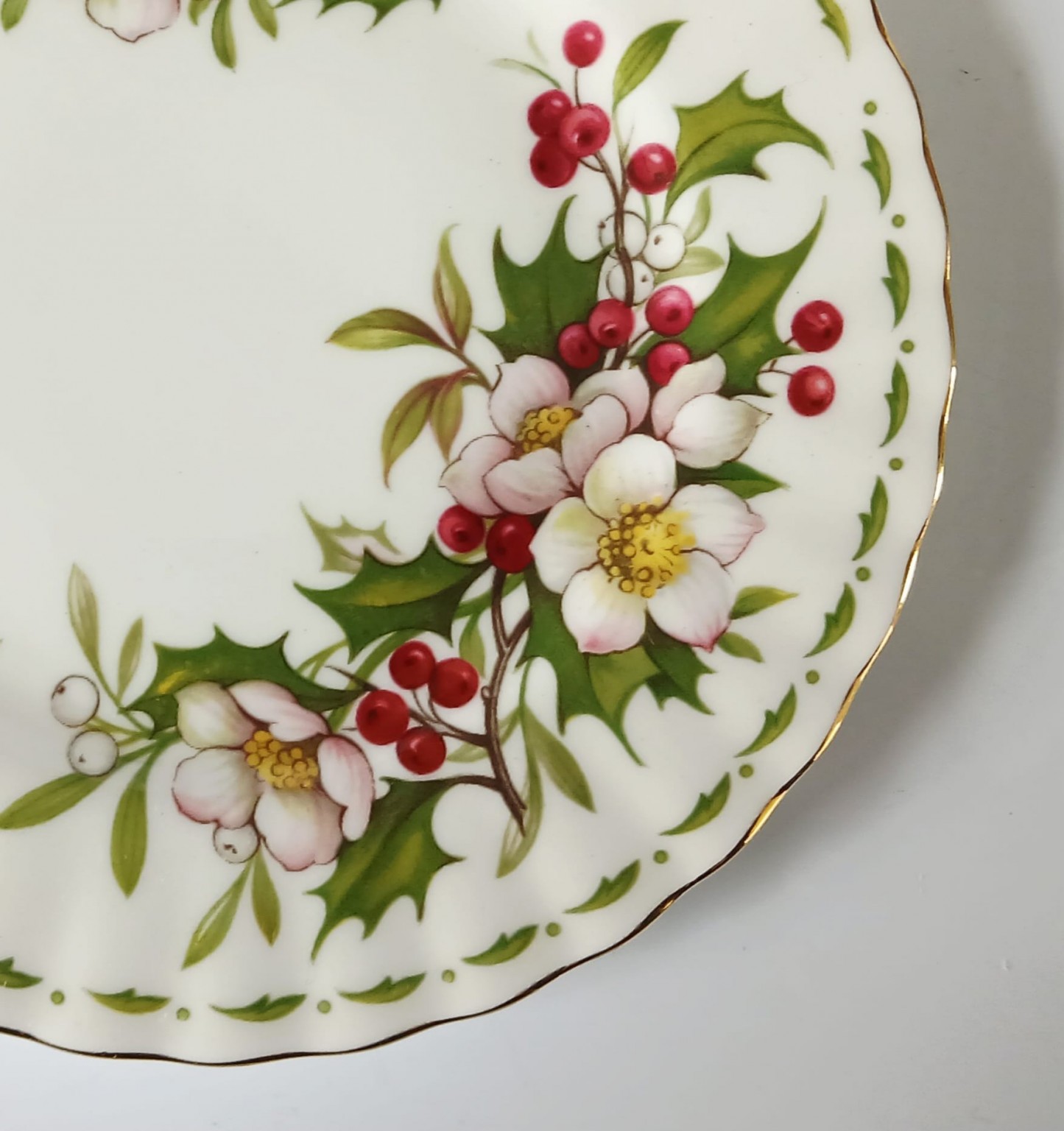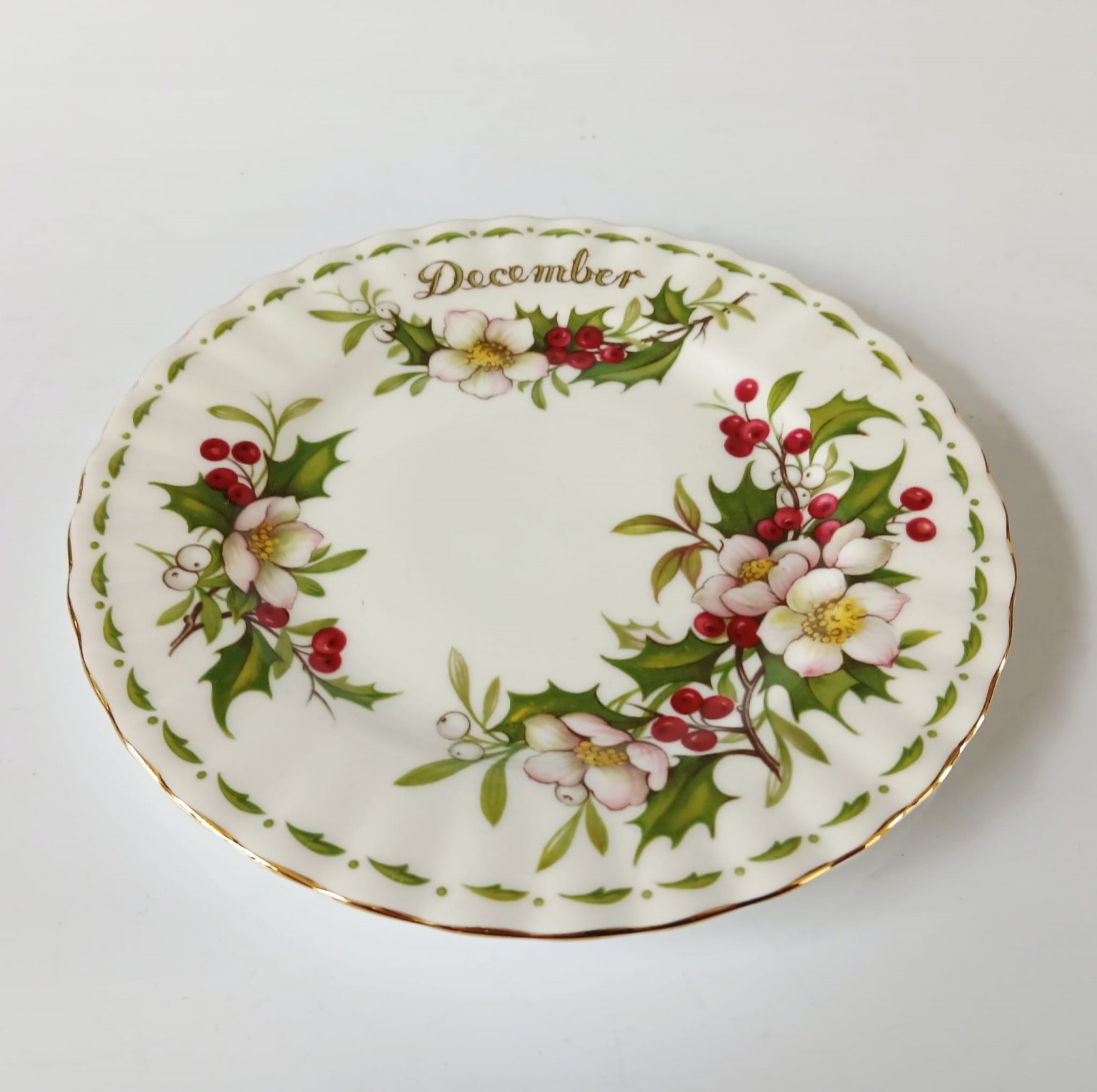 A tea plate from the Flower of the Month Series produced by Royal Albert featuring the month of December and the Christmas Rose flower.