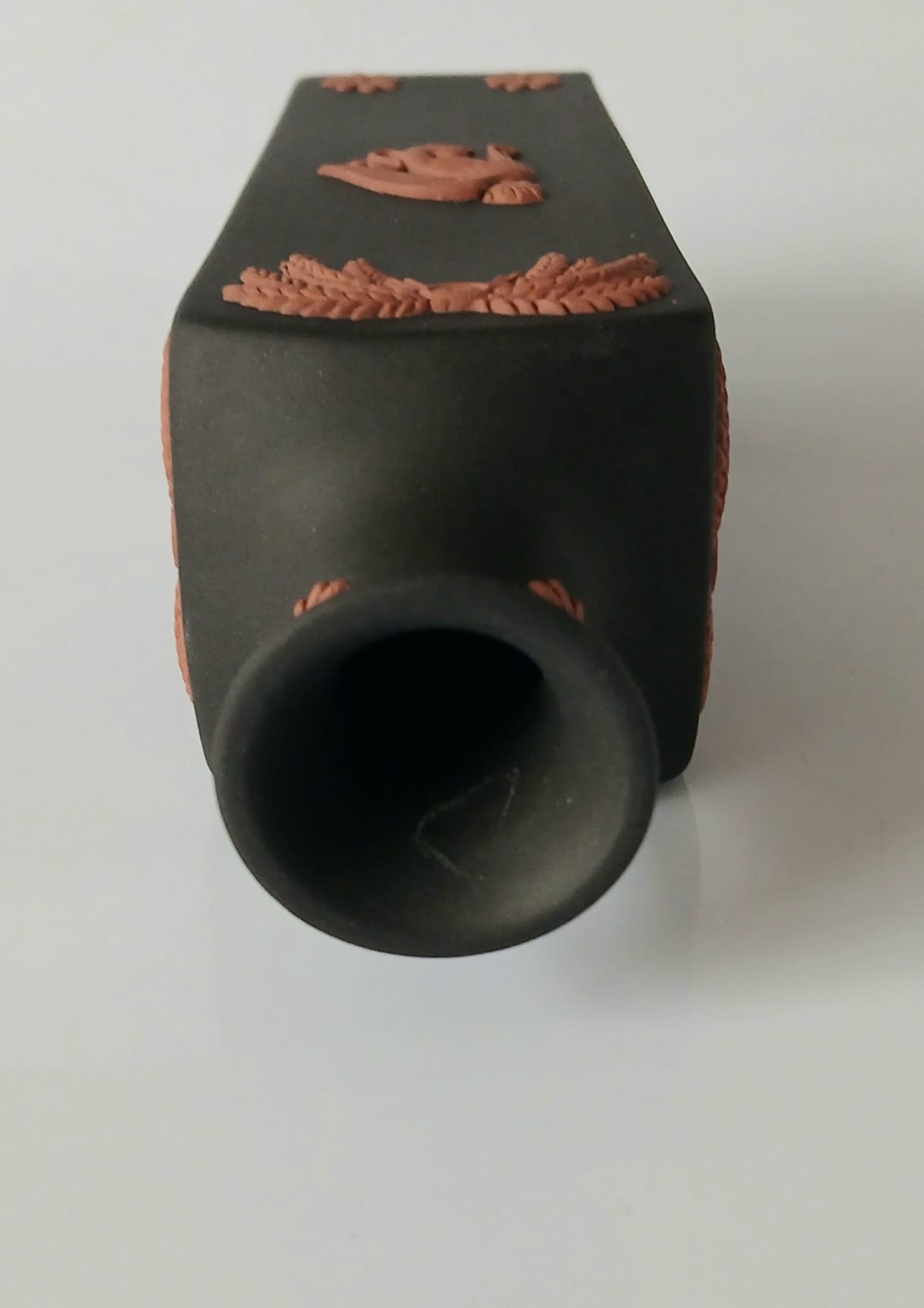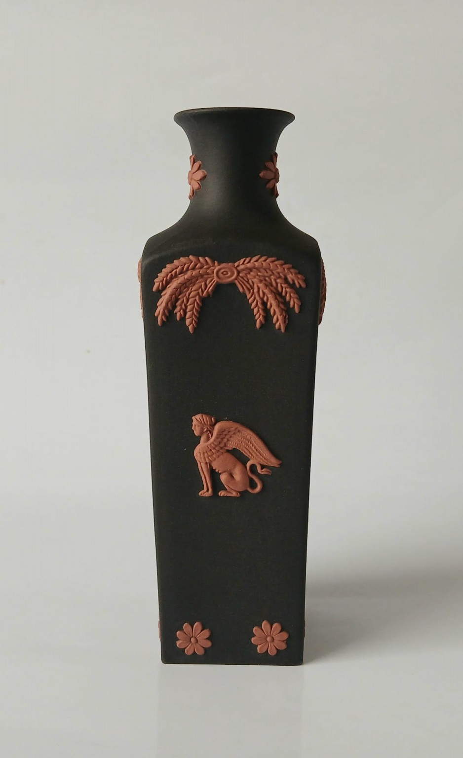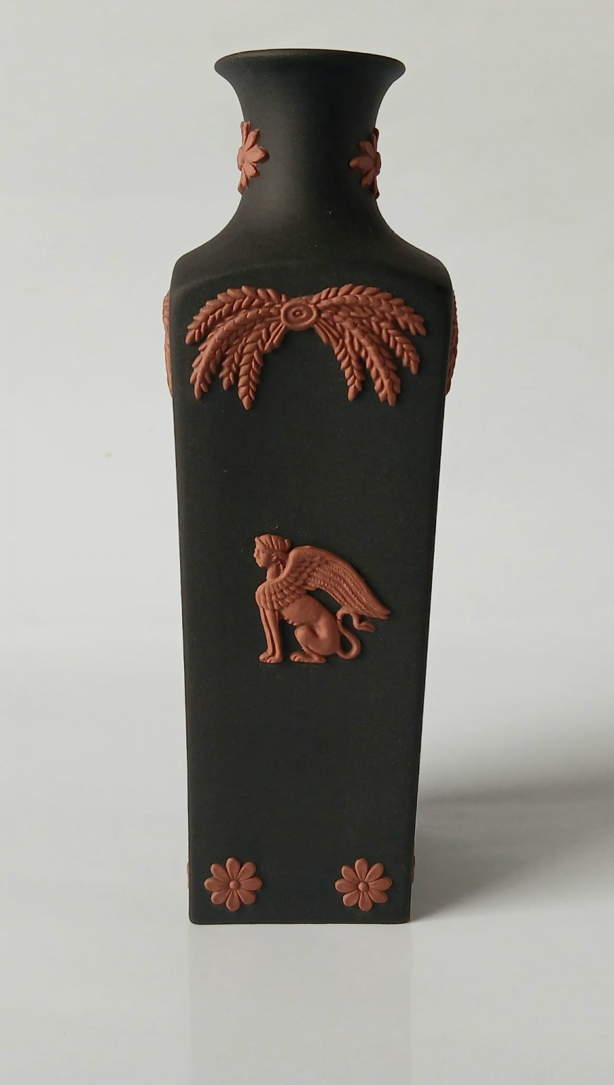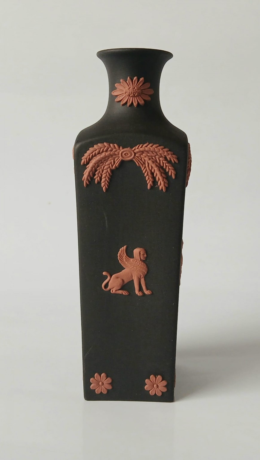 A Wedgwood black and terracotta jasperware bud vase featuring egyptian motifs.