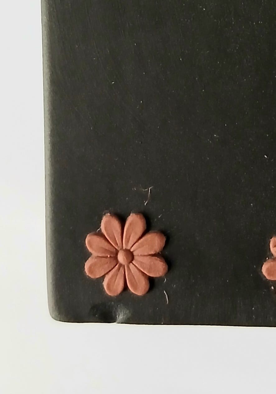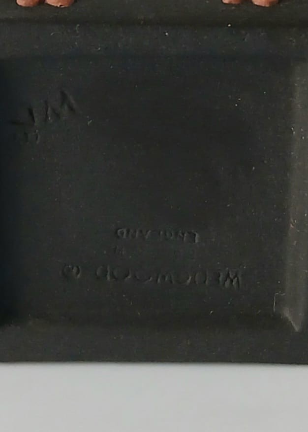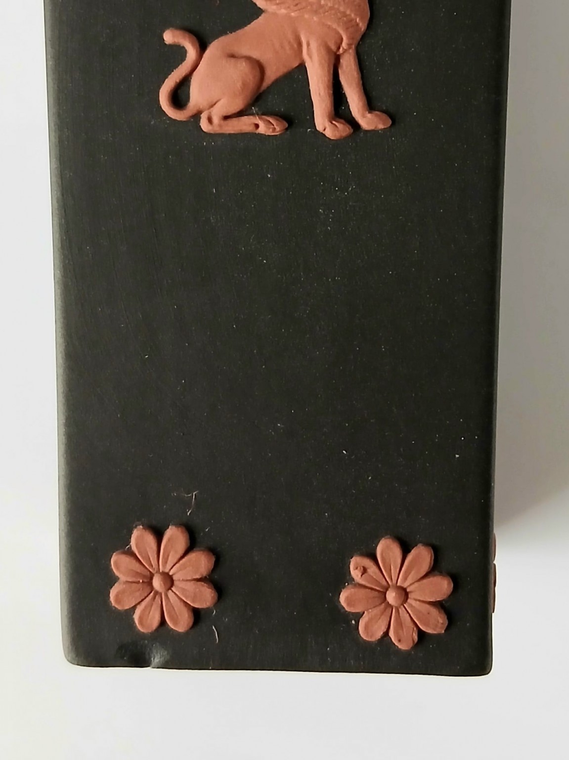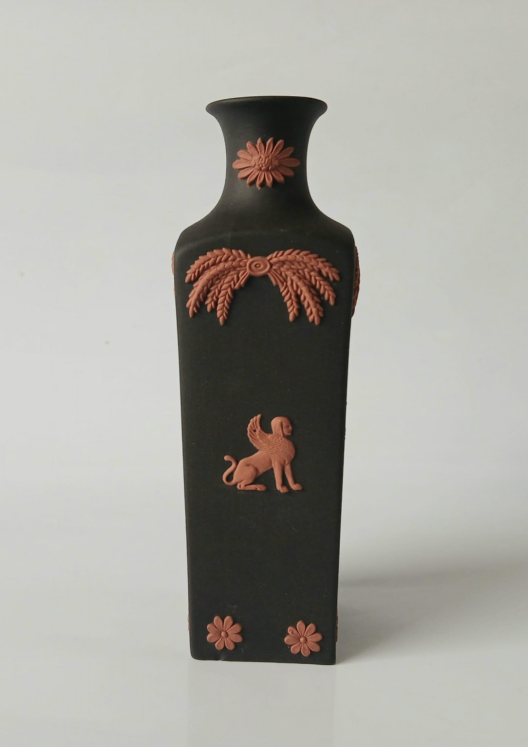 A Wedgwood black and terracotta jasperware bud vase featuring egyptian motifs.