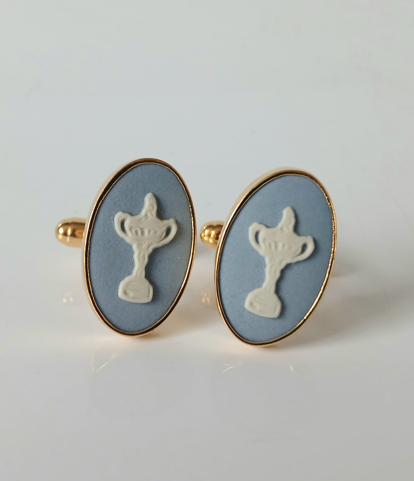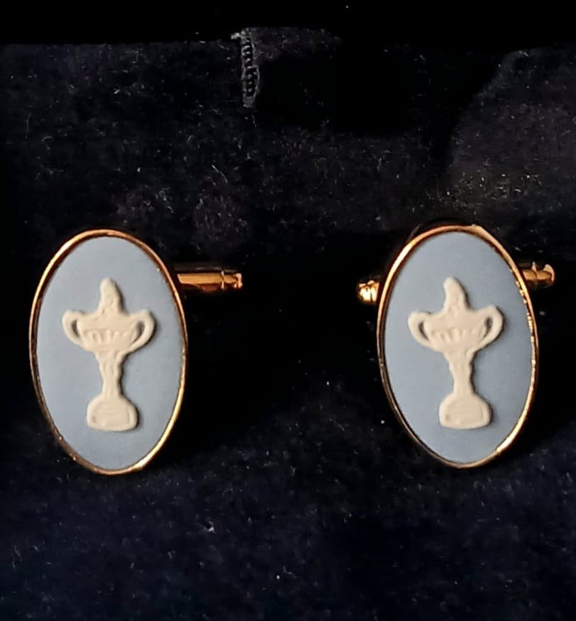 A pair of Wedgwood blue Jasperware cufflinks both featuring a white bas-relief of The Ryder Cup set in gold coloured metal together with a Wedgwood presentation box.