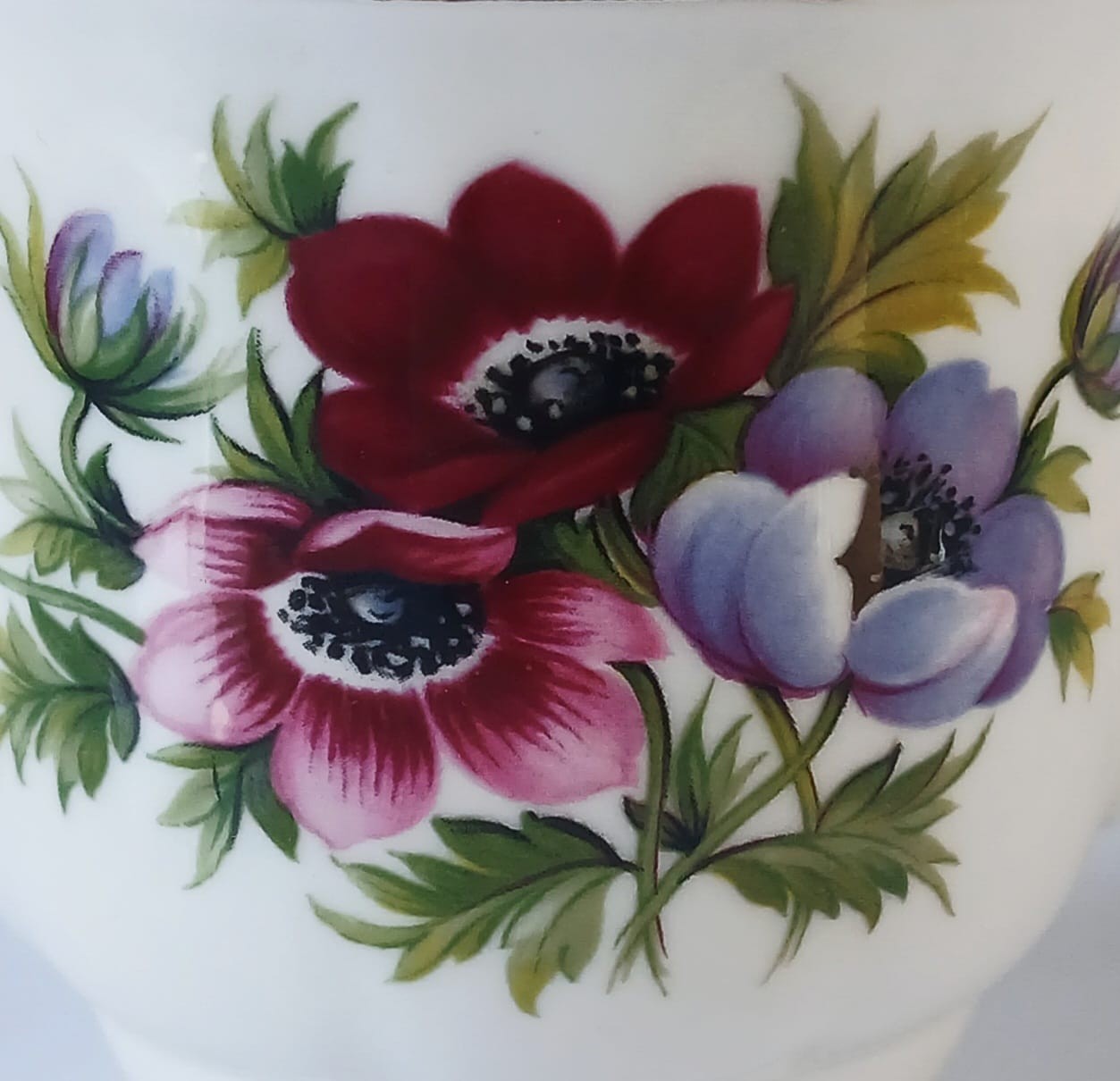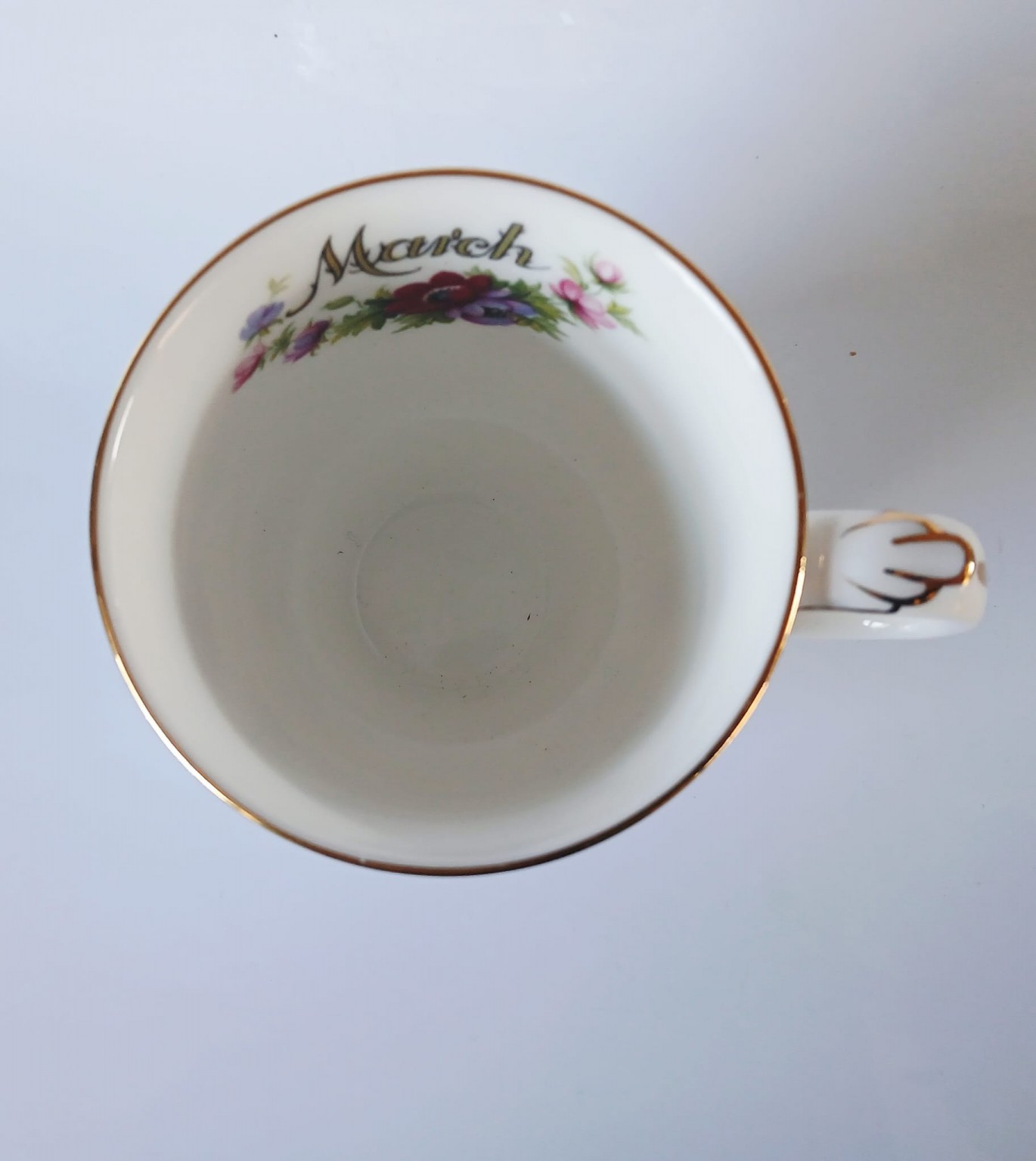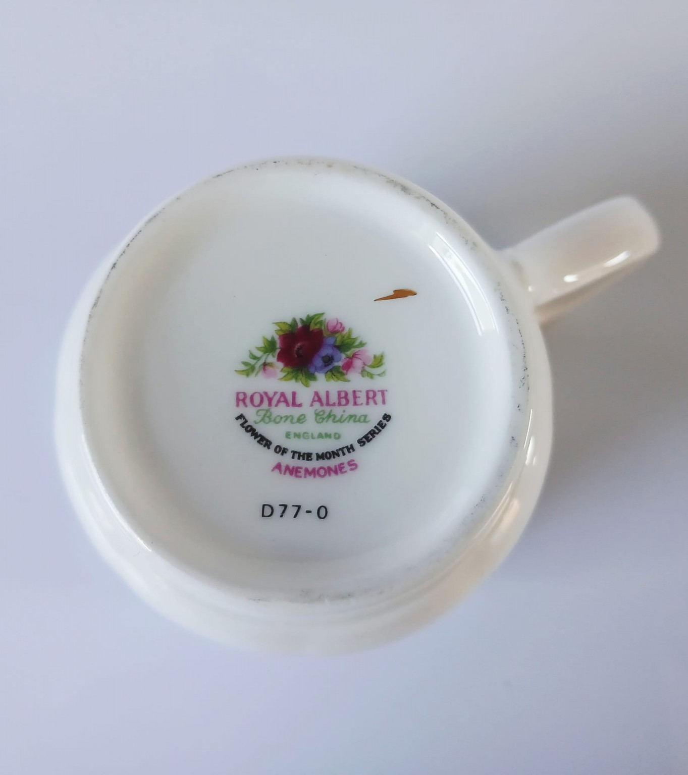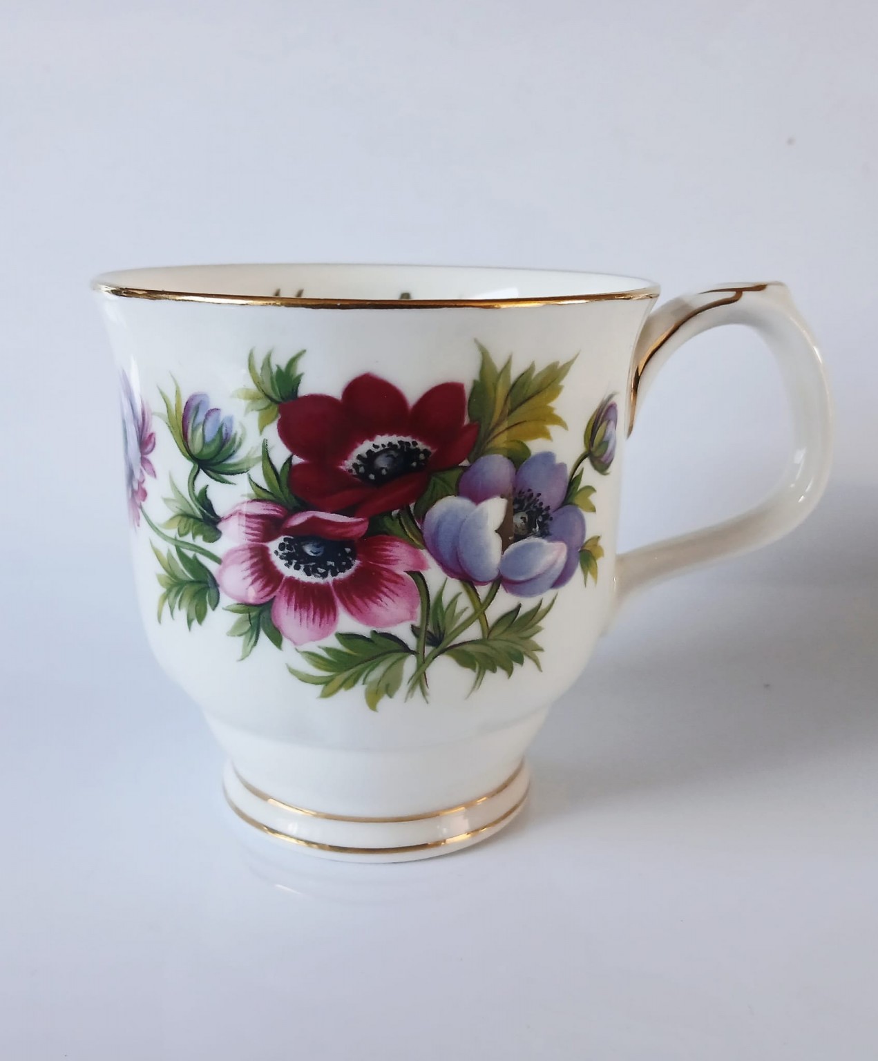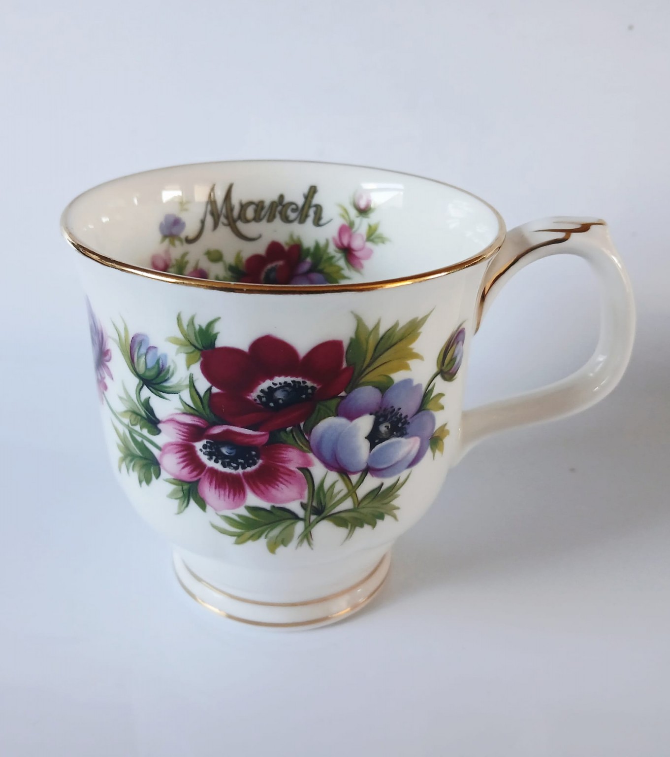 A mug from the Flower of the Month Series produced by Royal Albert featuring the month of March and the Anemones flower.