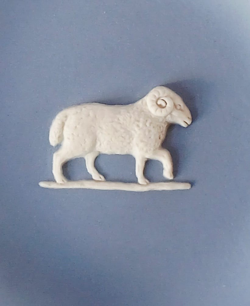 A Wedgwood blue jasperware pin dish featuring a white bas-relief of a ram representing Aries the first astrological sign of the zodiac.