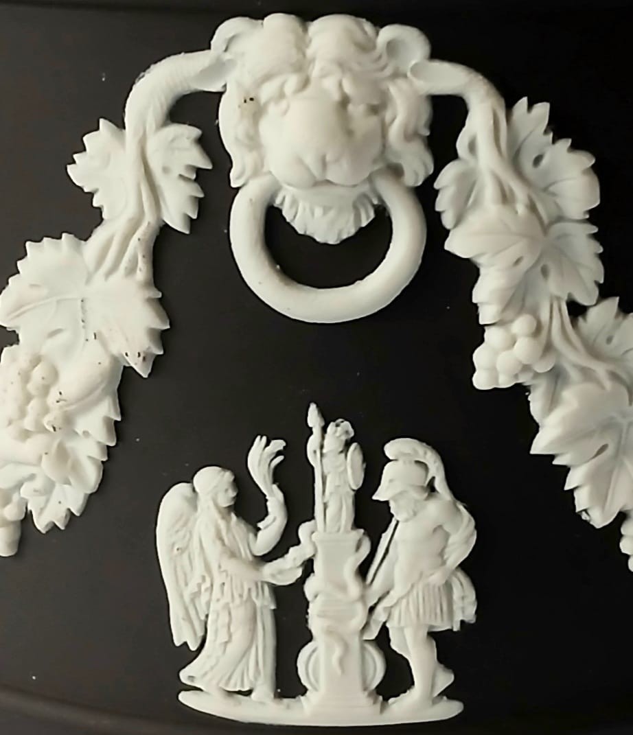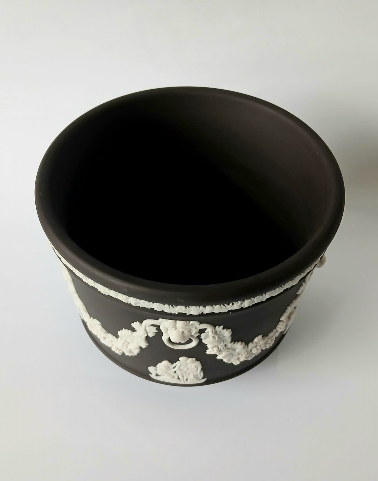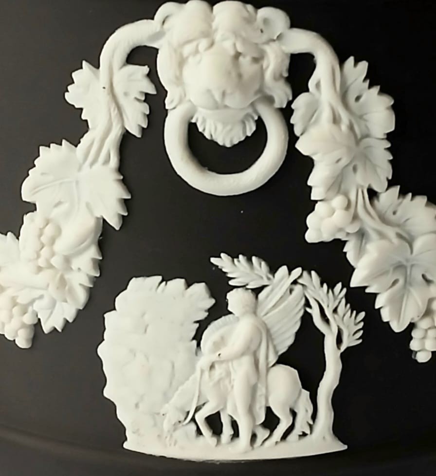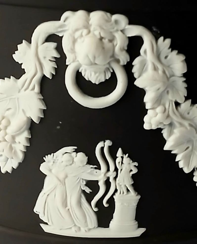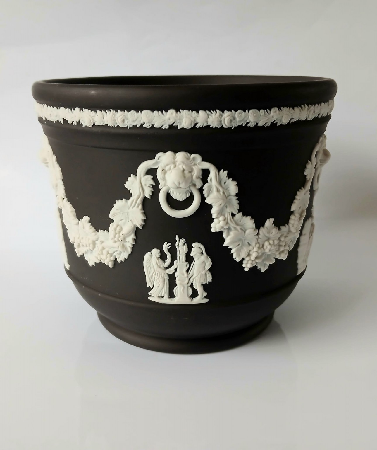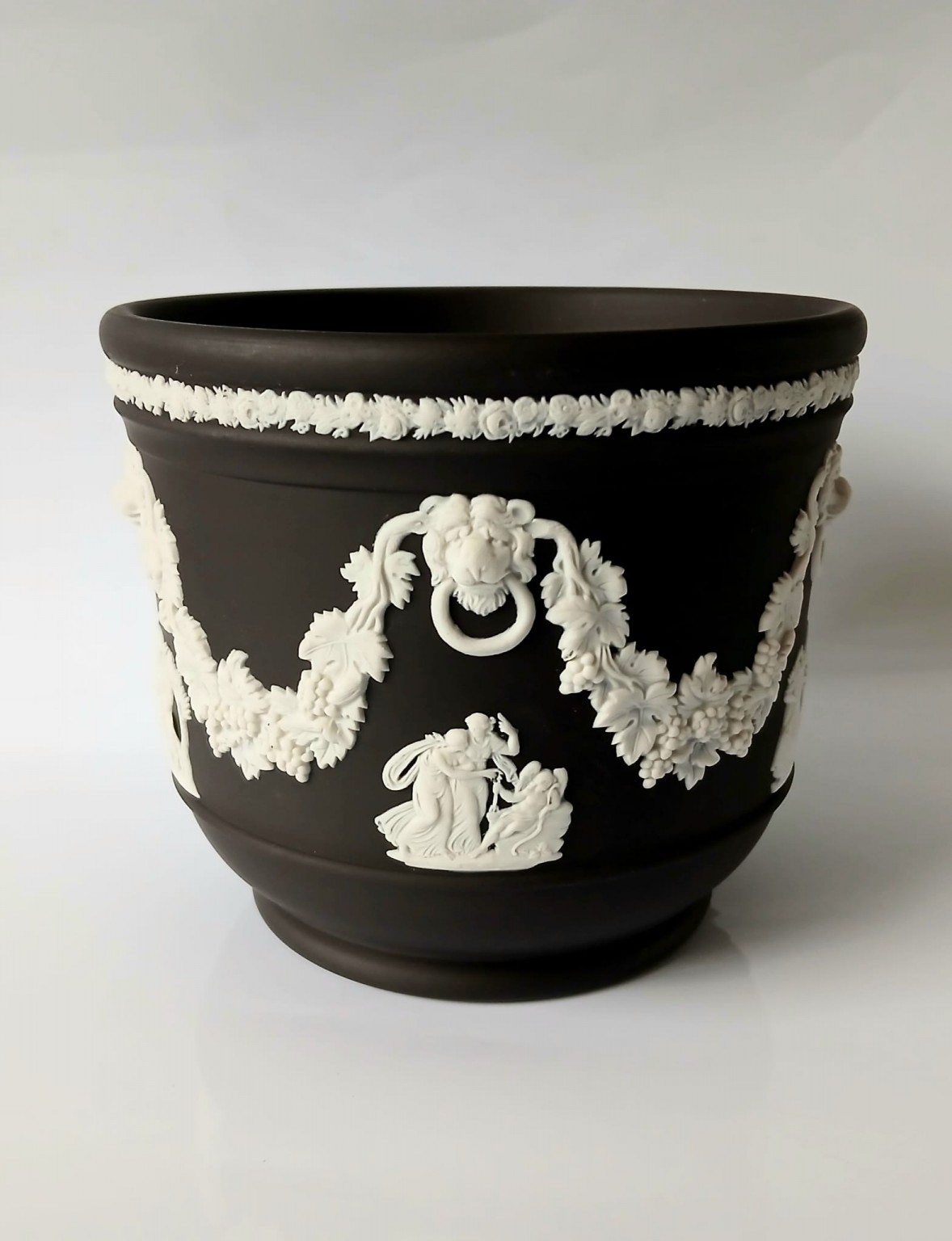 A Wedgwood black jasperware planter featuring white bas-reliefs of a lions heads along with a vine garland and classical scenes.